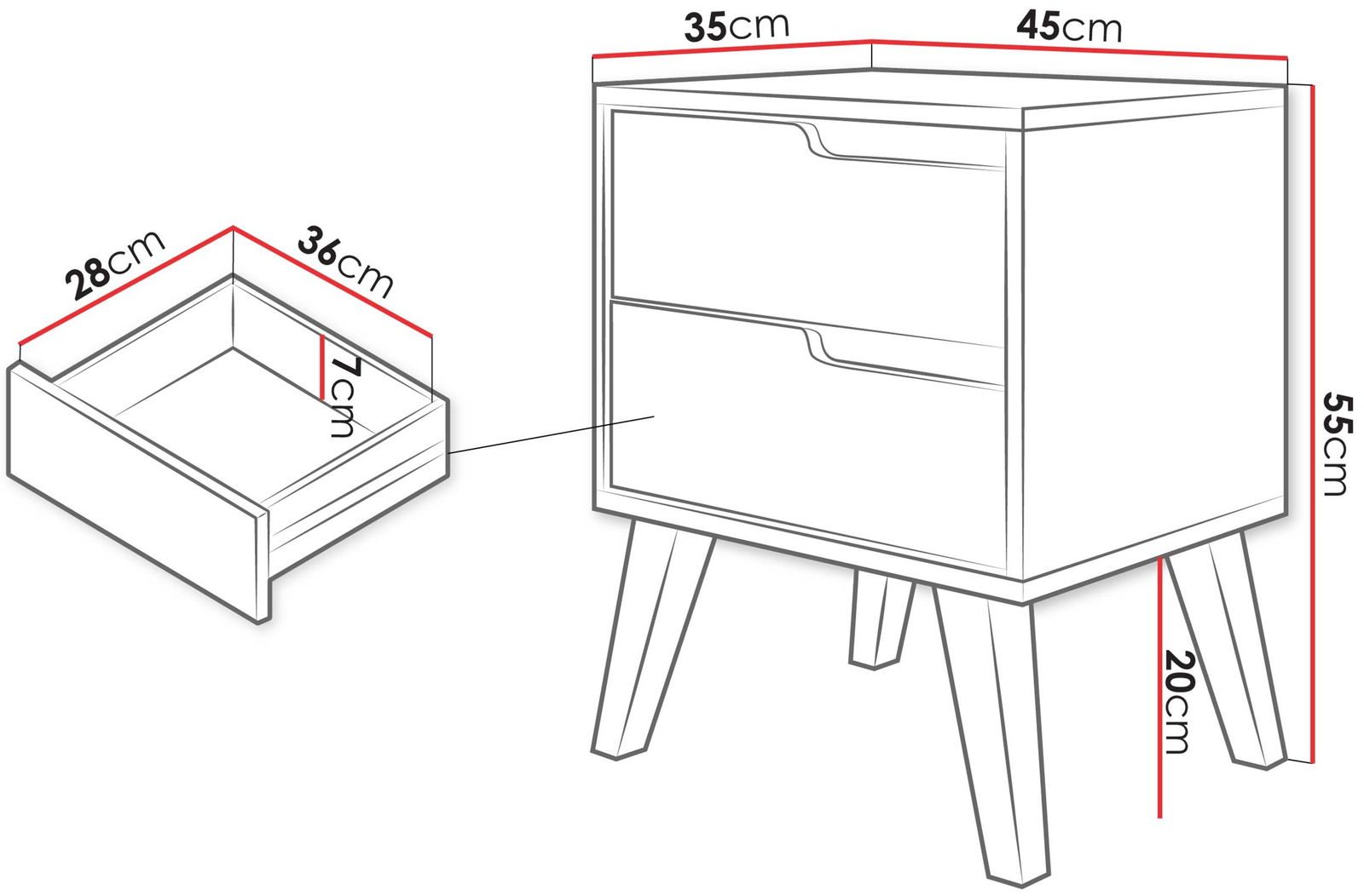 Ένα κομψό και πρακτικό κομοδίνο που αποτελεί ιδανική λύση για να έχετε στο ύψος του κρεβατιού σας όλα όσα χρειάζεστε καθημερινά. Διαθέτει δύο ευρύχωρα συρτάρια που σας βοηθούν να διατηρείτε τα αντικείμενα σας τακτοποιημένα και σε κοντινή απόσταση. Με λιτό, διαχρονικό σχεδιασμό, ταιριάζει εύκολα σε κάθε υπνοδωμάτιο ή χώρο ξεκούρασης.