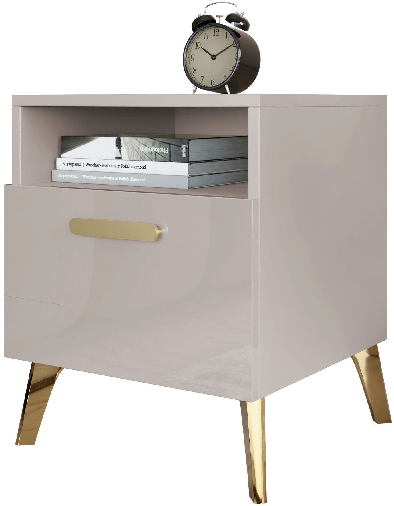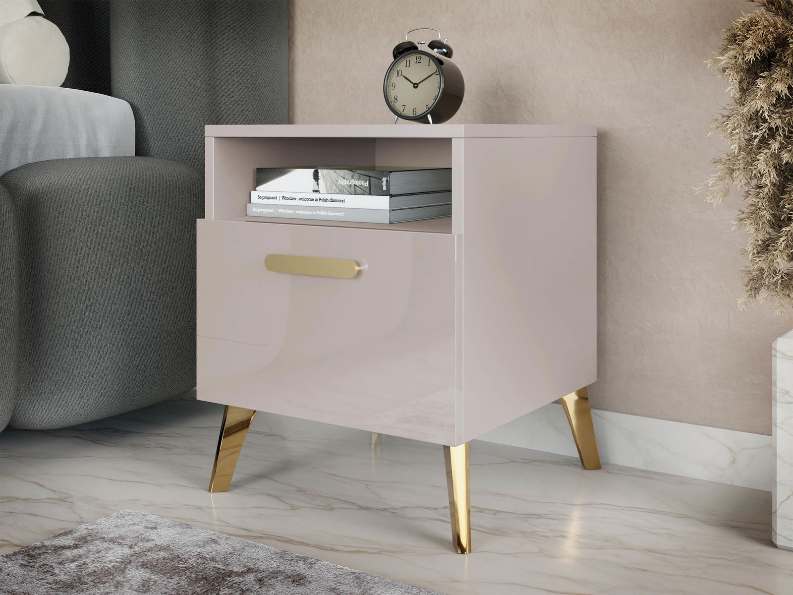 Το κομοδίνο Picru 1SZ είναι ένας συνδυασμός μοντέρνου στυλ και πρακτικότητας. Ένα απλό σχήμα υπερυψωμένο πάνω σε χρυσά πόδια θα αποτελέσει μια εξαιρετική προσθήκη στην κρεβατοκάμαρα, προσθέτοντας τάξη και κύρος στο χώρο. Το έπιπλο διαθέτει γυαλιστερές μετώπες, γεγονός που προσδίδει στο σύνολο έναν πολυτελή χαρακτήρα.