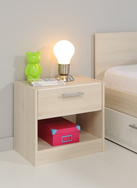 Κομοδίνο Scala με συρτάρι και ράφι. Μπορείτε να το συνδυάσετε με τη σειρά Scala. Διατίθεται σε χρώμα δρυς ανοιχτό.