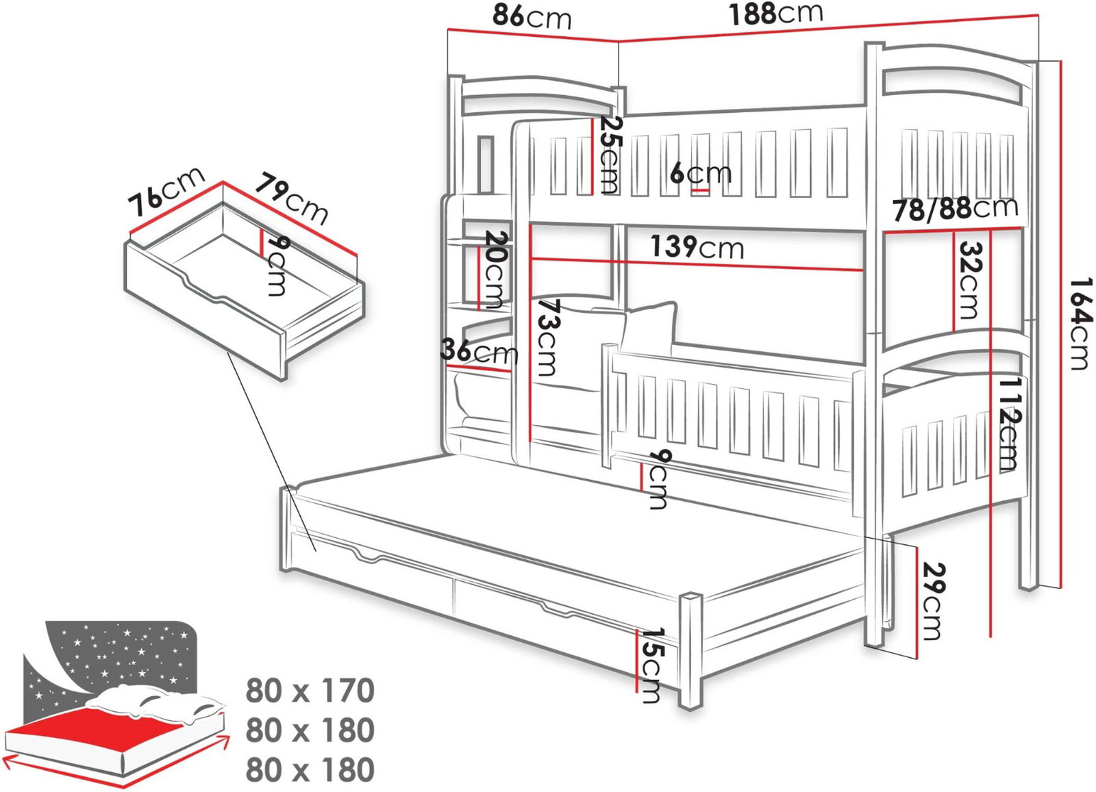 * Η σκάλα που επιτρέπει την πρόσβαση στο κρεβάτι είναι καθολική, ο πελάτης αποφασίζει από ποια πλευρά (αριστερά/δεξιά) θα συναρμολογηθεί.