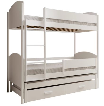 Η κουκέτα Lia με προστατευτικό κάγκελο είναι μια εξαιρετική επιλογή για τους γονείς που αναζητούν μια ασφαλή, λειτουργική και κομψή λύση για το παιδικό δωμάτιο. Χάρη στον καλά μελετημένο σχεδιασμό του, παρέχει όχι μόνο άνετους χώρους ύπνου για δύο άτομα, αλλά και πρόσθετο αποθηκευτικό χώρο. Η κατασκευή του αποτελείται από δύο επίπεδα και ένα επιπλέον συρόμενο κάτω κρεβάτι. Ο στιβαρός σκελετός του εξασφαλίζει σταθερότητα και ασφάλεια, ενώ η ενσωματωμένη σκάλα επιτρέπει την εύκολη πρόσβαση στο επάνω επίπεδο. Τα προστατευτικά κάγκελα στο επάνω κρεβάτι φροντίζουν για την ασφάλεια του παιδιού κατά τη διάρκεια του ύπνου. Επιπλέον, το κρεβάτι διαθέτει ευρύχωρα συρτάρια, τα οποία αποτελούν έναν πρακτικό χώρο αποθήκευσης για σεντόνια, παιχνίδια ή άλλα παιδικά αντικείμενα. Το Lia είναι ο ιδανικός συνδυασμός λειτουργικότητας και μοντέρνου σχεδιασμού για το παιδικό δωμάτιο.