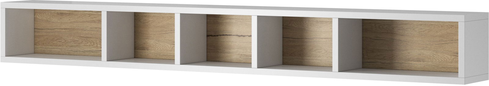 Κρεμαστή ραφιέρα Toldo σε λευκό χρώμα με λεπτομέρεις σε δρυς. Συνδυάζεται αρμονικά με τα υπόλοιπα έπιπλα της σειράς Toldo ή μπορεί να τοποθετηθεί και ανεξάρτητα σε οποιοδήποτε χώρο