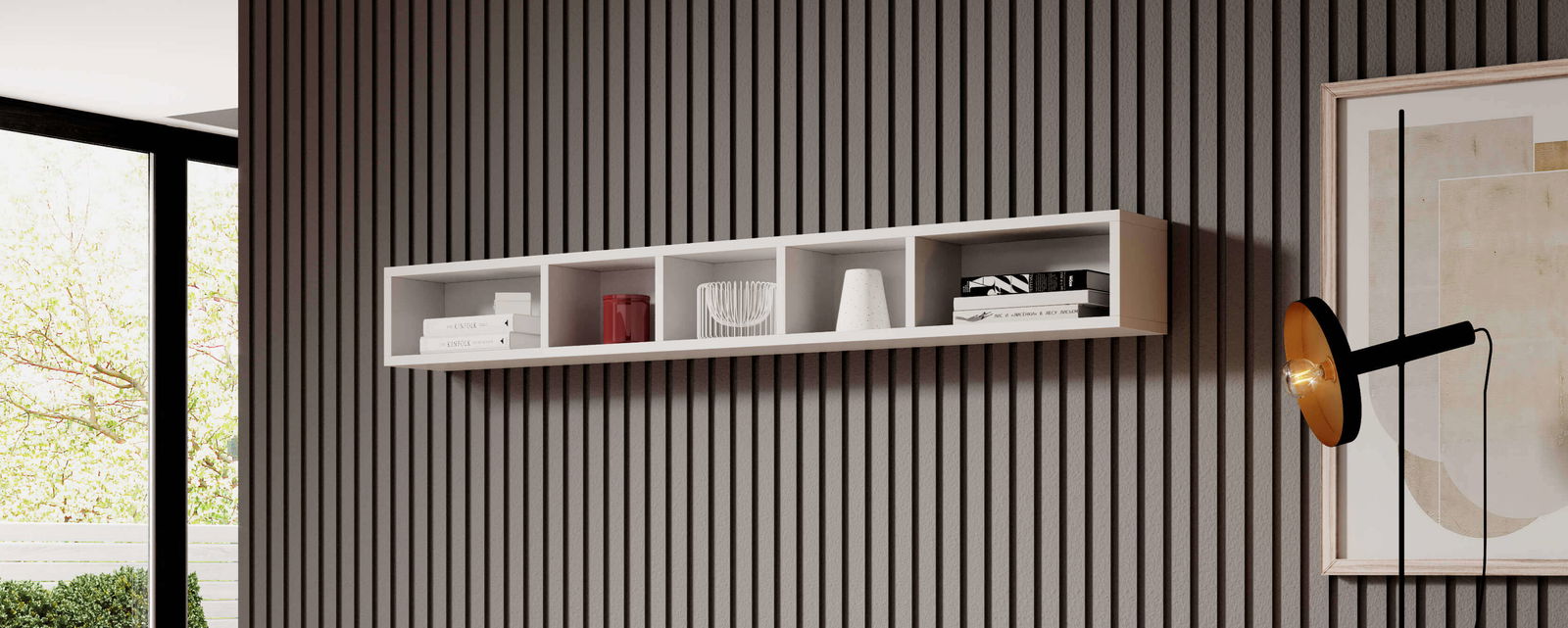Κρεμαστή ραφιέρα Toldo σε λευκό χρώμα με λεπτομέρεις σε δρυς. Συνδυάζεται αρμονικά με τα υπόλοιπα έπιπλα της σειράς Toldo ή μπορεί να τοποθετηθεί και ανεξάρτητα σε οποιοδήποτε χώρο