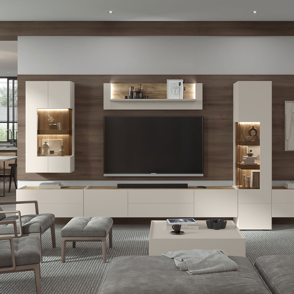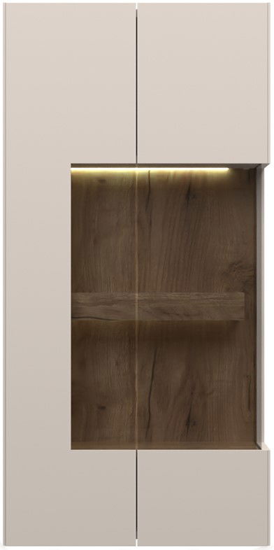 Κρεμαστή βιτρίνα Spike, μινιμαλ σχεδιασμού με πρακτικές λεπτομέρειες και μοντέρνα διχρωμία μπεζ – φυσικού ξύλου, με αποθηκευτικό, ιδανική για κάθε σαλόνι.