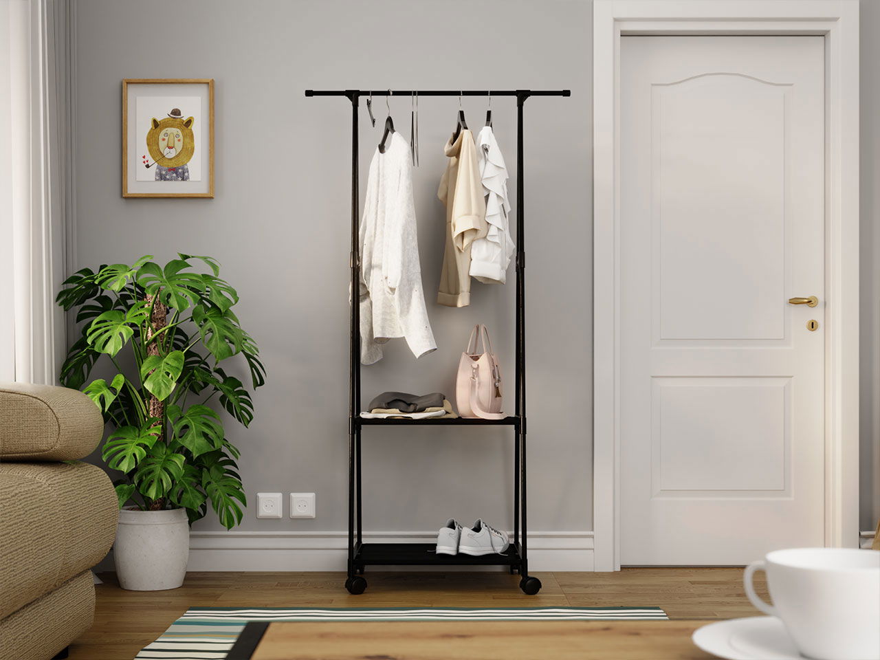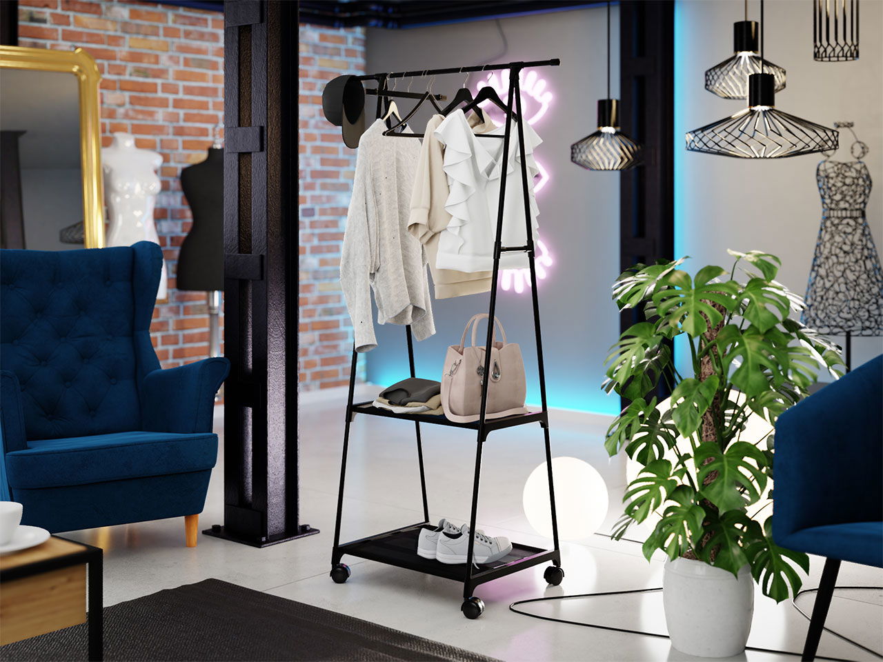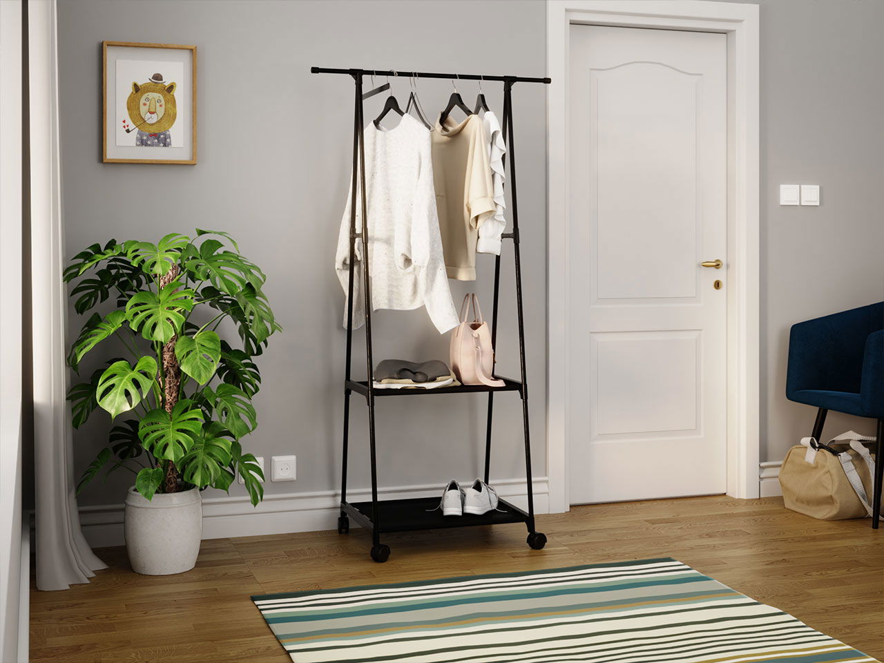 Κρεμάστρα Olazen μοντέρνου και ταυτόχρονα πρωτότυπου στυλ που θα ταιριάξει σε κάθε γωνιά του σπιτιού σας και θα ξεχωρίσει. Είναι εύκολη στην μεταφορά χάρη στις ρόδες που διαθέτει αλλά και τα δύο ράφια είναι εξαιρετικά για να τακτοποιείτε εύκολα τα πράγματά σας. Μια ιδανική επιλογή για να ανανεώστε τον χώρο σας.