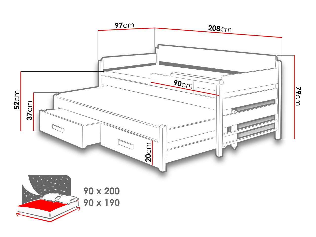 **το μέγιστο ύψος του κάτω στρώματος είναι 10 cm (εάν χρησιμοποιηθεί ένα στρώμα με μεγαλύτερο πάχος, δεν θα είναι δυνατή η συρόμενη τοποθέτηση του κρεβατιού)