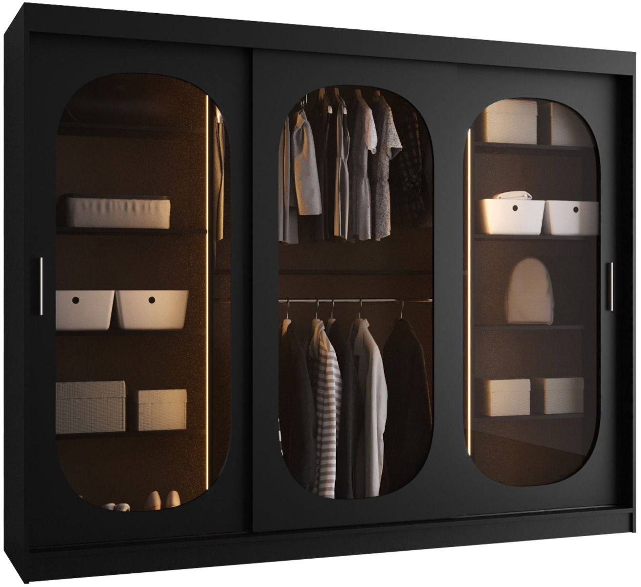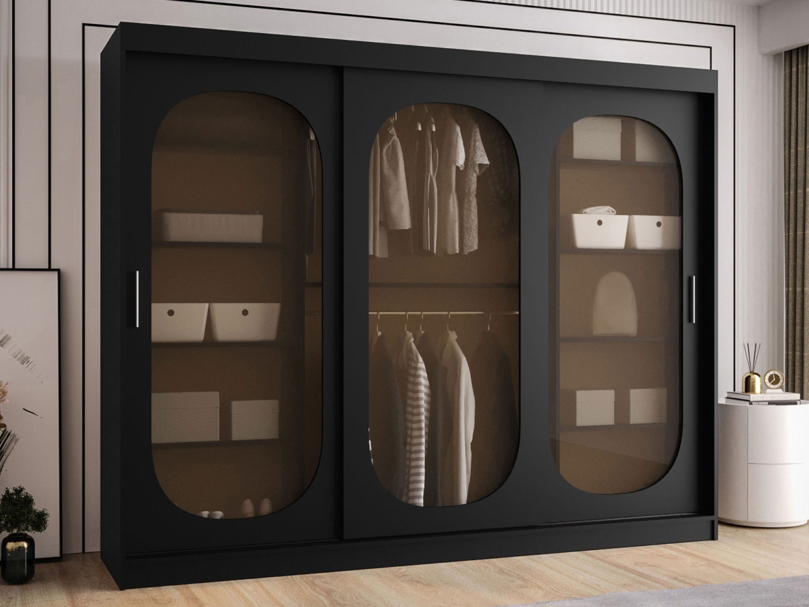 Η συρόμενη ντουλάπα Bahrajn 250 συνδυάζει μοντέρνο σχεδιασμό με πρακτικότητα. Οι μπροστινές επιφάνειες από φιμέ γυαλί δίνουν κομψότητα και μοντέρνα αισθητική, ενώ το ευρύχωρο εσωτερικό της, την καθιστούν ιδανική για οργάνωση ρούχων είτε από ένα άτομο είτε για κοινή χρήση.