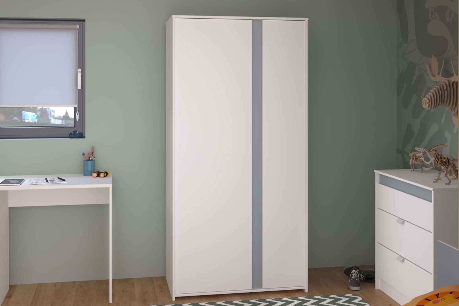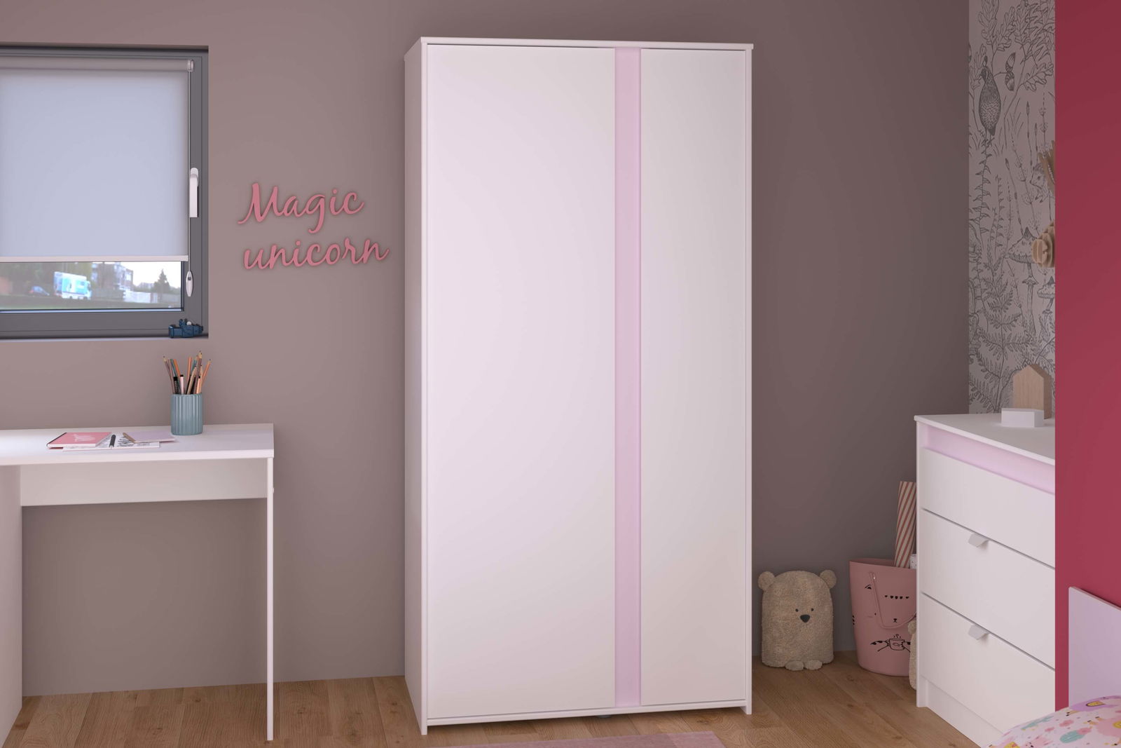 Η ντουλάπα Ballet δίφυλλη, λιτού σχεδιασμού, θα ολοκληρώσει ιδανικά το υπνοδωμάτιο του παιδιού σας προσφέροντας λύσεις αποθήκευσης. Τα χρωματιστά μέρη του επίπλου είναι αντιστρέψιμα δίνοντας σας την επιλογή να προσθέσετε είτε ροζ είτε γκρι λεπτομέρειες στον χώρο σας. Συνδυάστε την ιδανικά με τα υπόλοιπα έπιπλα της σειράς για ένα ολοκληρωμένο αποτέλεσμα επίπλωσης.