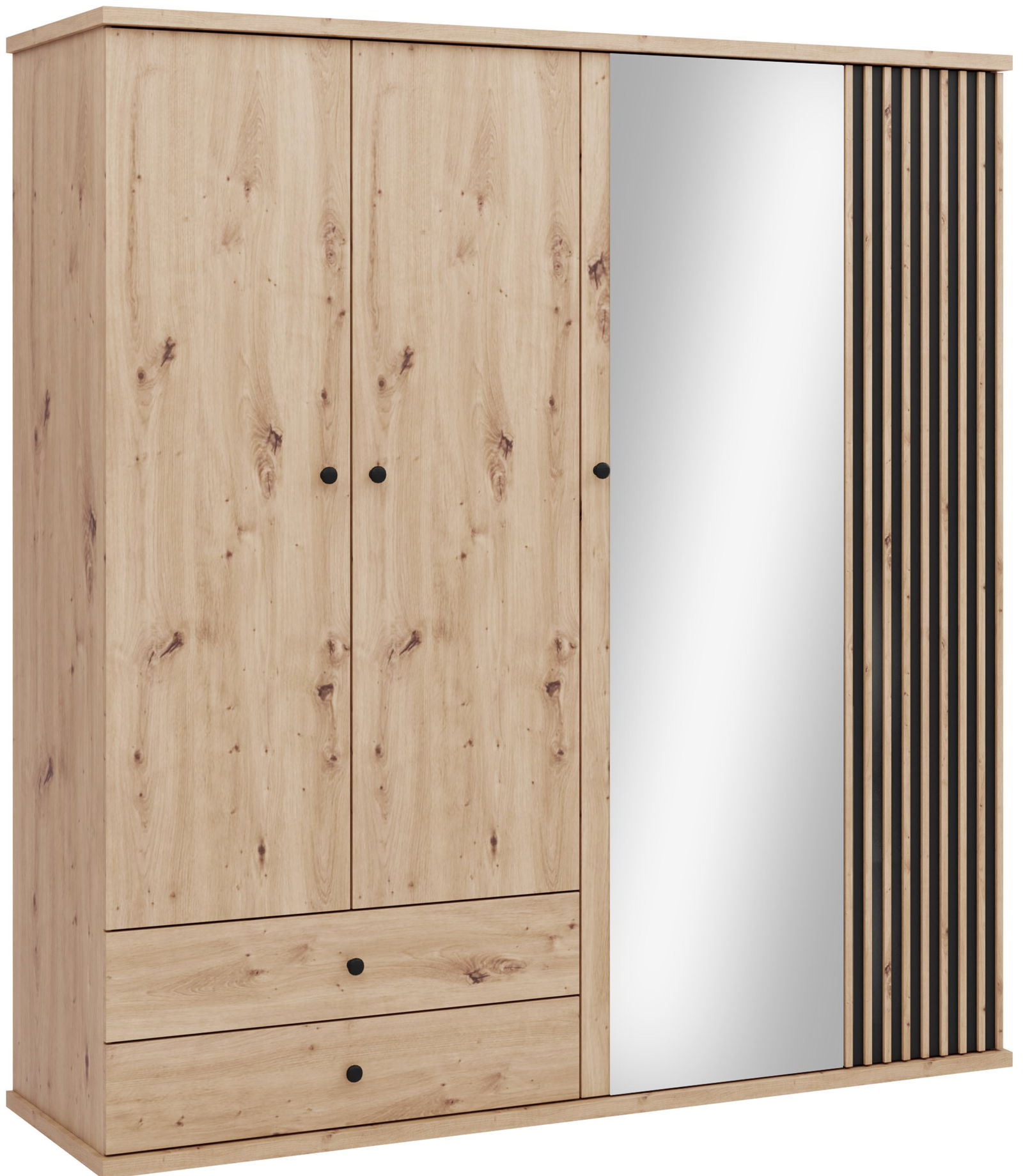 Η κομψή ντουλάπα Cali τετράφυλλη είναι ένα μείγμα μοντέρνου σχεδιασμού και ρουστίκ γοητείας. Το ζεστό ξύλινο φινίρισμα και οι κάθετες μαύρες γραμμές δημιουργούν μια μοναδική και εντυπωσιακή εμφάνιση. Η πόρτα με καθρέφτη προσθέτει λειτουργικότητα και κάνει το δωμάτιο να μοιάζει πιο ευρύχωρο.