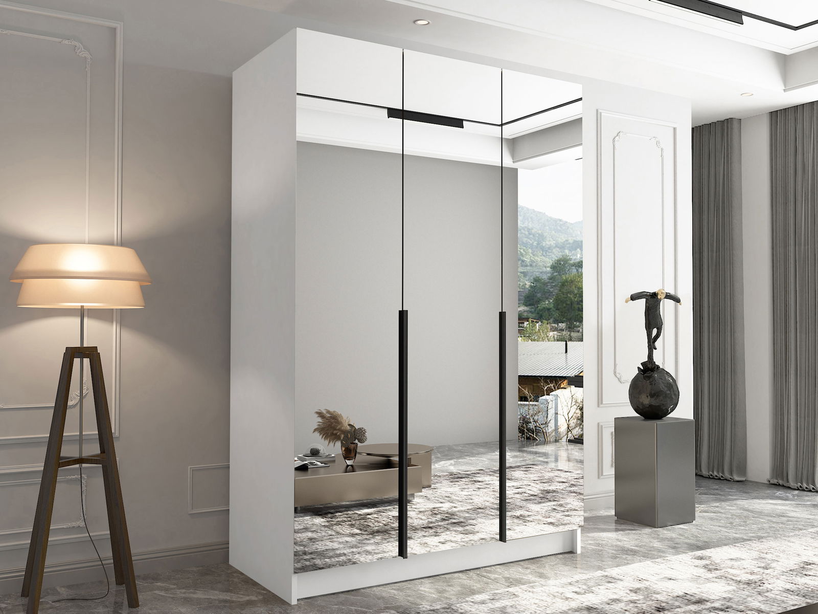 Μια κομψή ντουλάπα Πρακτικών διαστάσεων που αποτελεί απαραίτητη προσθήκη σε κάθε χώρο είναι η δίφυλλη ντουλάπα Calia. Μέσα στην ντουλάπα θα βρείτε πρακτικά ράφια και ράγα για να τοποθετήσετε τα ρούχα σας.Εξωτερικά η ντουλάπα διαθέτει τρεις ολόσωμους καθρέπτες που αναβαθμήζουν τον χόρο σας.Είναι μια επιλογή για να χαρίσετε νέα πνοή στον χώρο του σπιτιού σας και μεγάλη πρακτικότητα.