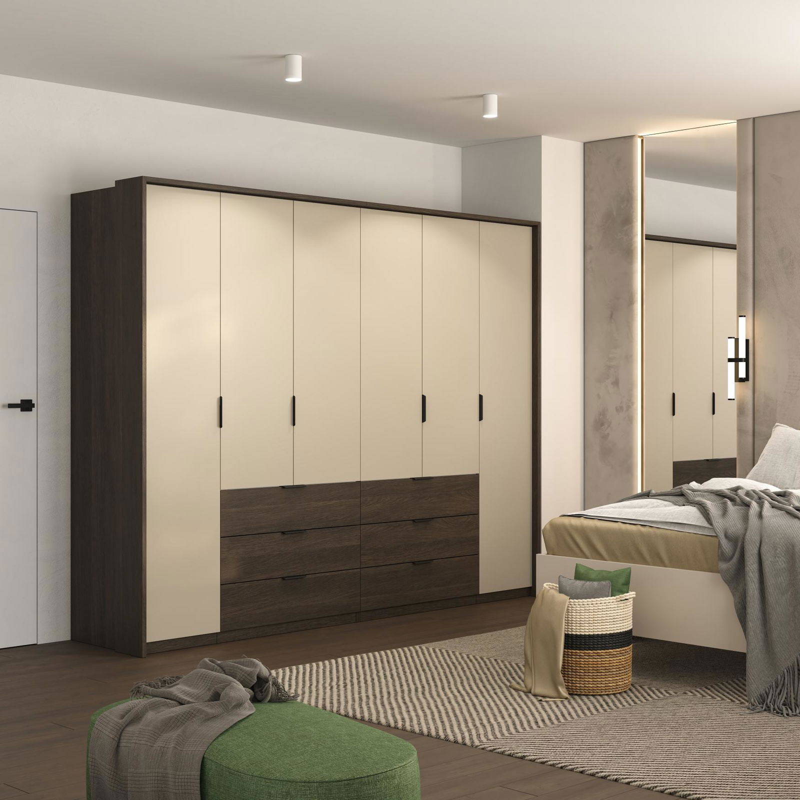 Η εξάφυλλη ντουλάπα Lamon είναι ένα σύγχρονο και λειτουργικό έπιπλο που συνδυάζει κομψότητα και πρακτική οργάνωση. Ο εσωτερικός της σχεδιασμός περιλαμβάνει ράγες για το κρέμασμα ρούχων, ευρύχωρα ράφια και συρτάρια που προσφέρουν άνετη και τακτοποιημένη αποθήκευση για κάθε ανάγκη της καθημερινότητας.