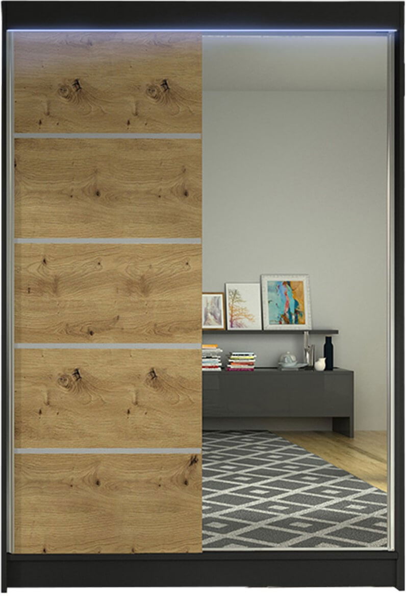 Ντουλάπα Lino III με LED φωτισμό, μοντέρνου σχεδιασμού. Διαθέτει συρόμενες πόρτες, ώστε να βρίσκετε εύκολα και γρήγορα οτιδήποτε θέλετε καθώς και καθρέπτη τοποθετημένο με έναν ιδιαίτερο τρόπο, που θα τονίσει και θα μεγαλώσει τον χώρο σας. Στο εσωτερικό της διαθέτει φαρδιά μπάρα για κρέμασμα ρούχων και ευρύχωρα ράφια, για να αποθηκεύσετε ό,τι χρειάζεστε.