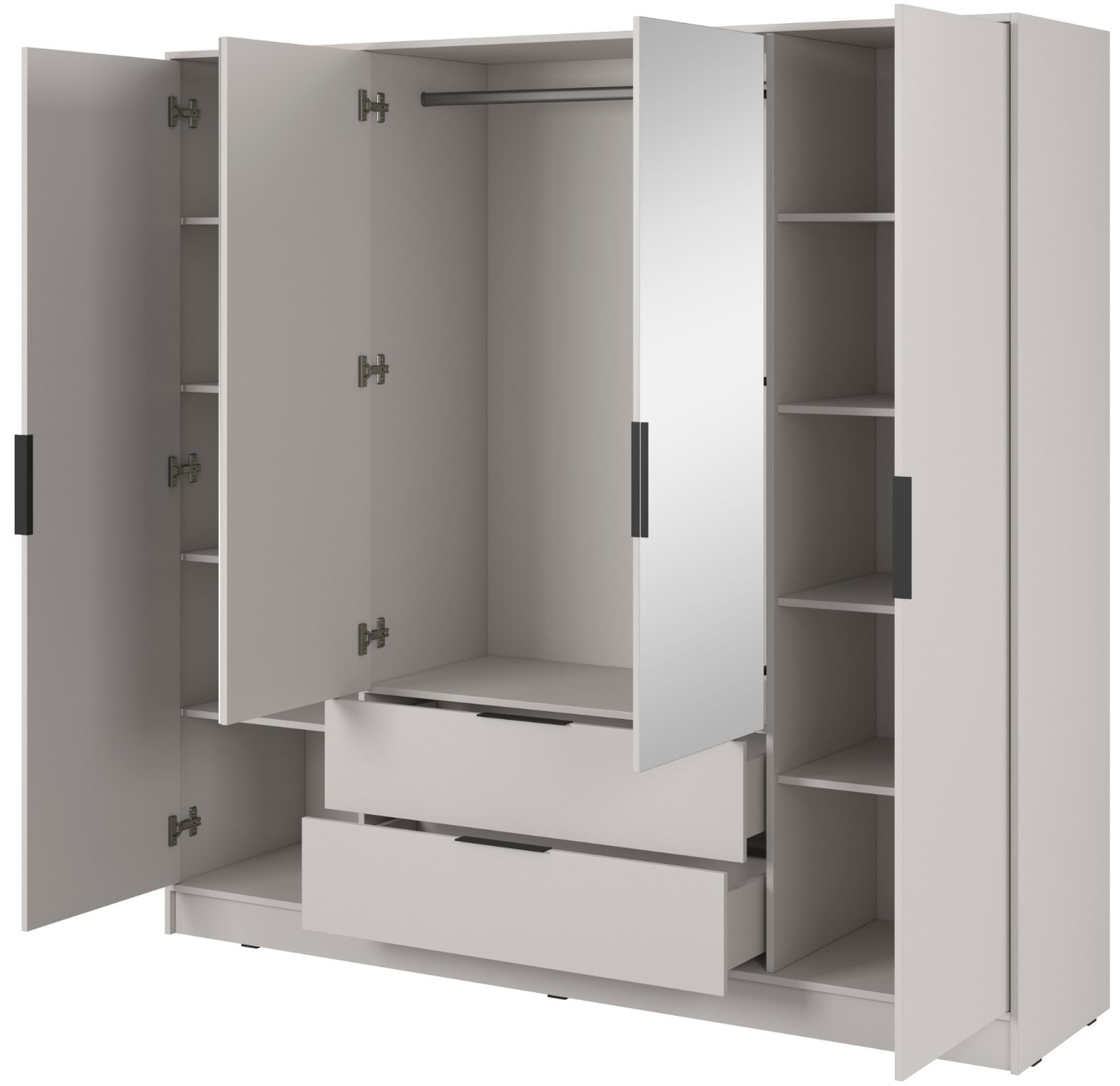 Αναβαθμίστε τον αποθηκευτικό χώρο του υπνοδωματίου σας με την κομψή και μοντέρνα Ντουλάπα Nelly τετράφυλλη IIΙ. Κατασκευασμένη με μινιμαλιστικό σχεδιασμό, αυτή η ντουλάπα συνδυάζει άψογα το στυλ και τη λειτουργικότητα. Ο συνδυασμός κλειστών φύλλων και των καθρέπτων δημιουργεί μια οπτικά ελκυστική αντίθεση, ενώ το ευρύχωρο εσωτερικό προσφέρει άφθονο χώρο αποθήκευσης για τα ρούχα και τα πράγματά σας.