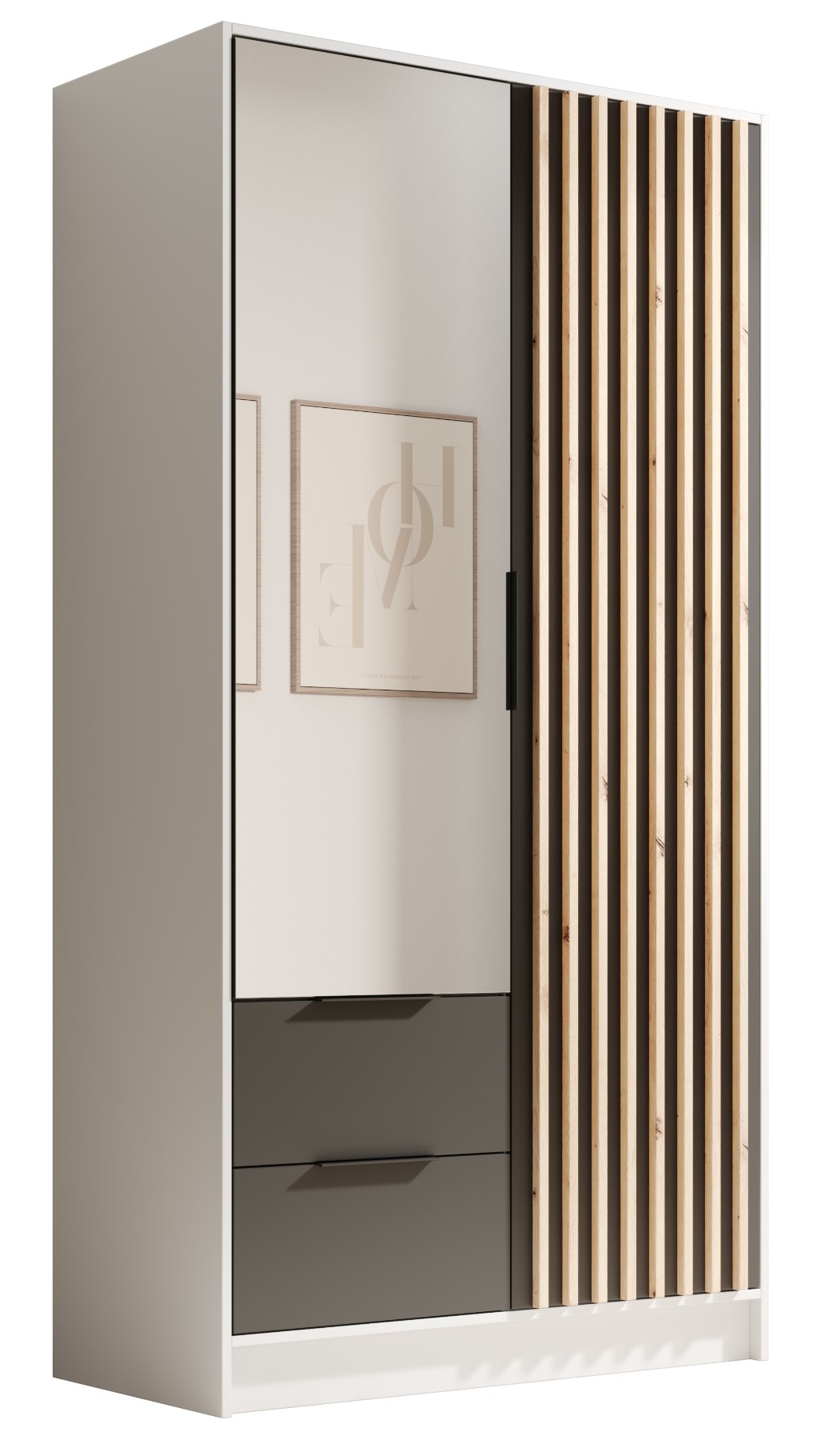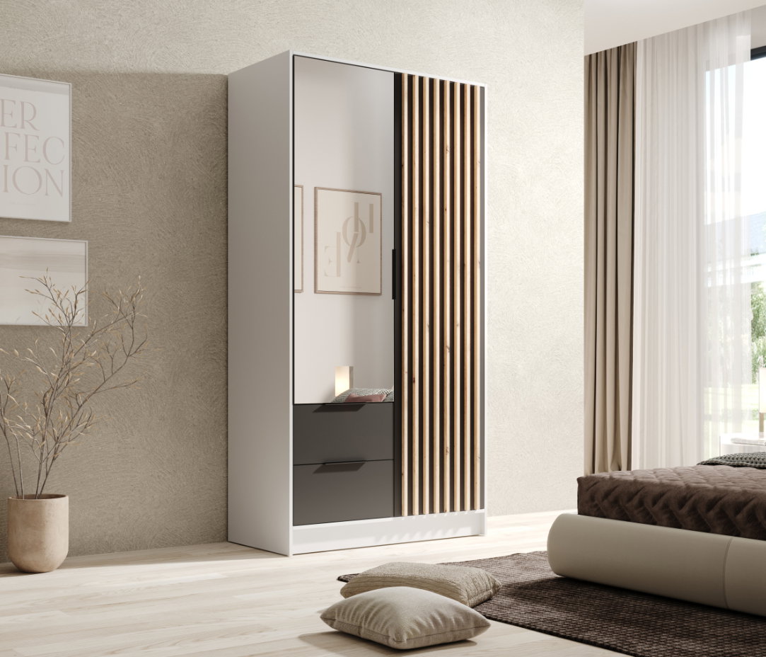 Η μοντέρνα και κομψή ντουλάπα Niriam δίφυλλη είναι η τέλεια προσθήκη σε κάθε υπνοδωμάτιο. Ο κομψός σχεδιασμός της και ο συνδυασμός των θυρών με καθρέφτη και των κάθετων ξύλινων πινελιών δημιουργούν ένα οπτικά ελκυστικό και λειτουργικό έπιπλο. Η ντουλάπα Niriam είναι συμπαγής, ιδανική για μικρότερα δωμάτια κι όχι μόνο!