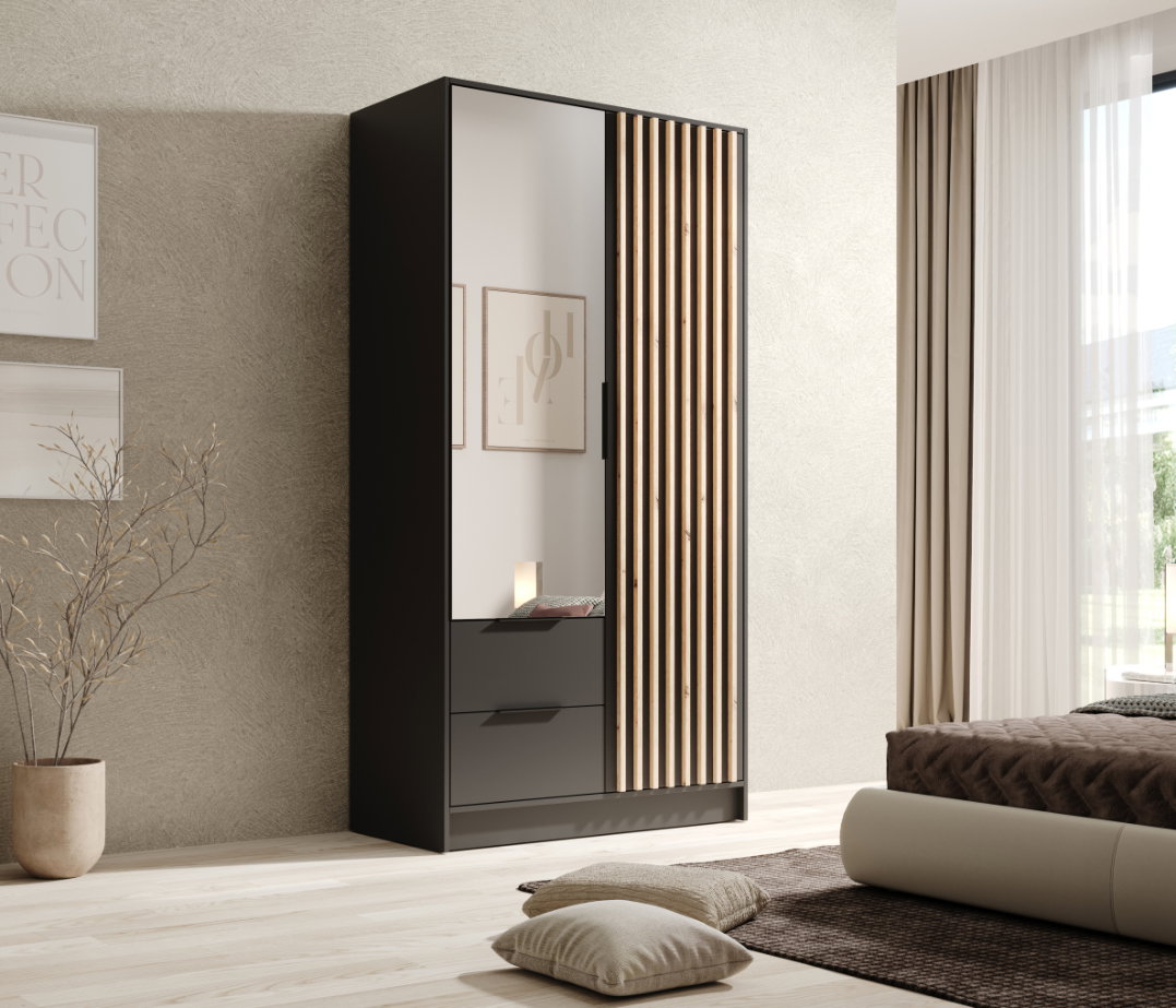 Η μοντέρνα και κομψή ντουλάπα Niriam δίφυλλη είναι η τέλεια προσθήκη σε κάθε υπνοδωμάτιο. Ο κομψός σχεδιασμός της και ο συνδυασμός των θυρών με καθρέφτη και των κάθετων ξύλινων πινελιών δημιουργούν ένα οπτικά ελκυστικό και λειτουργικό έπιπλο. Η ντουλάπα Niriam είναι συμπαγής, ιδανική για μικρότερα δωμάτια κι όχι μόνο!