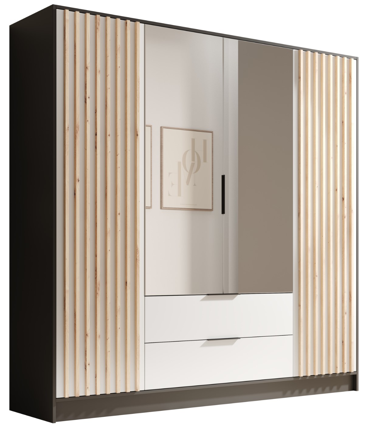 Η μοντέρνα και κομψή ντουλάπα Niriam τετράφυλλη είναι η τέλεια προσθήκη σε κάθε υπνοδωμάτιο. Ο κομψός σχεδιασμός της και ο συνδυασμός των θυρών με καθρέφτη και των κάθετων ξύλινων πινελιών δημιουργούν ένα οπτικά ελκυστικό και λειτουργικό έπιπλο. Η ντουλάπα Niriam με την ευρύχωρη διάταξη, είναι ιδανική για την αποθήκευση περισσότερων ρούχων και αντικειμένων.