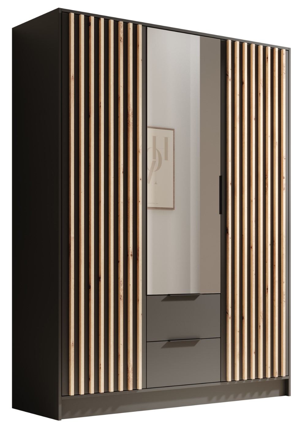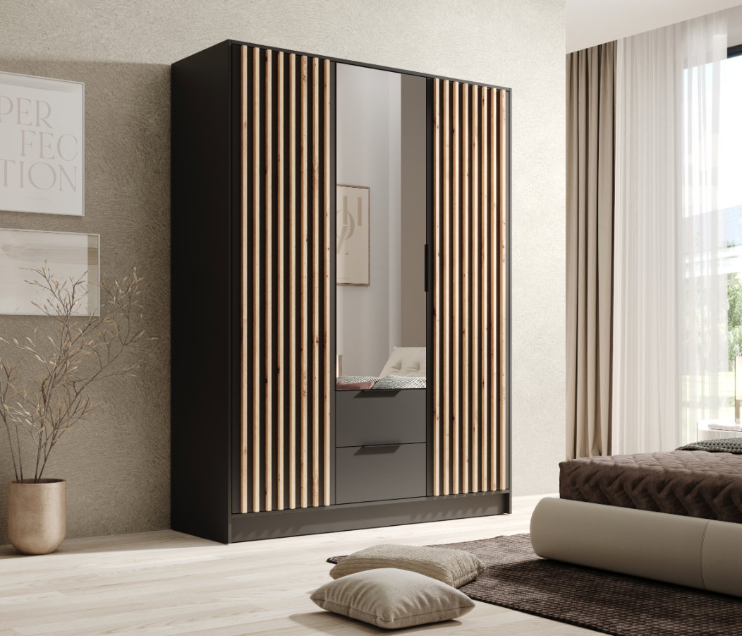 Η μοντέρνα και κομψή ντουλάπα Niriam τρίφυλλη είναι η τέλεια προσθήκη σε κάθε υπνοδωμάτιο. Ο κομψός σχεδιασμός της και ο συνδυασμός των θυρών με καθρέφτη και των κάθετων ξύλινων πινελιών δημιουργούν ένα οπτικά ελκυστικό και λειτουργικό έπιπλο. Η ντουλάπα Niriam είναι ένας τέλειος συμβιβασμός σε χώρο και μέγεθος!