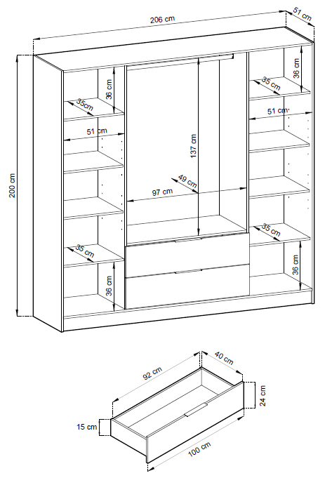 – Ντουλάπι με ράγα για κρεμαστά ρούχα στο κέντρο