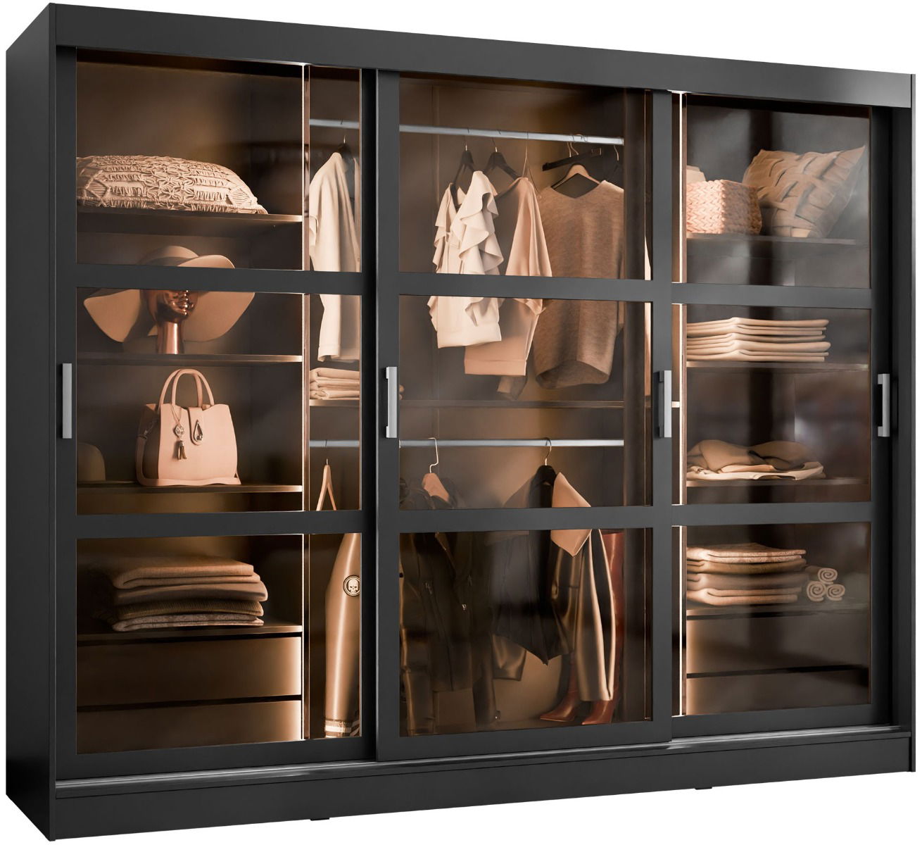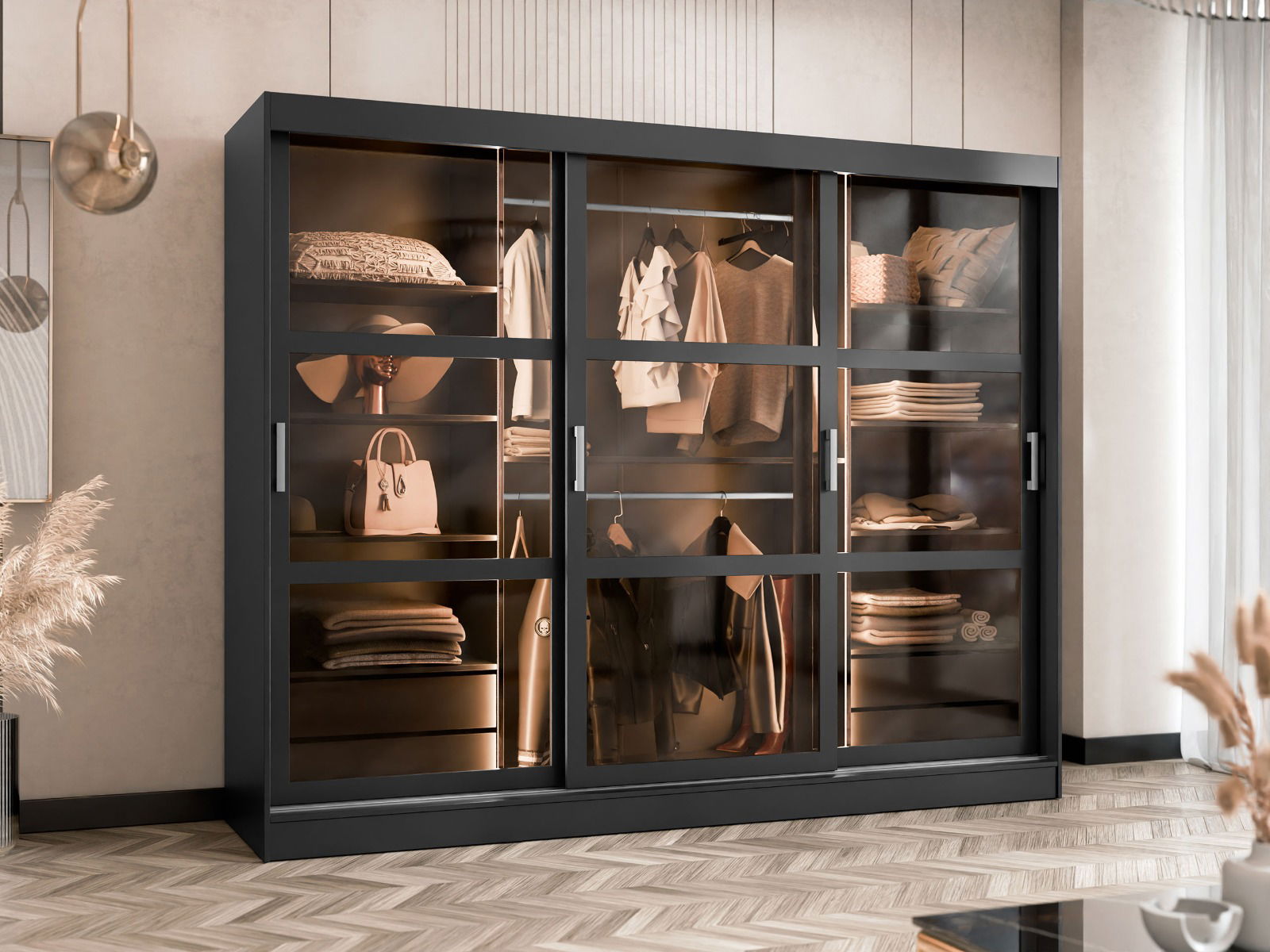 Η συρόμενη ντουλάπα Norlio είναι μια εντυπωσιακή ντουλάπα με γυάλινες πόρτες, ιδανική για να οργανώσετε με στυλ τα ρούχα και τα αξεσουάρ σας. Ο μοντέρνος σχεδιασμός της,με τις διαφανείς γυάλινες επιφάνειες, προσθέτει μια πινελιά κομψότητας σε κάθε χώρο. Διαθέτει άφθονο αποθηκευτικό χώρο με ράφια και κρεμάστρες, ενώ τα συρτάρια στο κάτω μέρος προσφέρουν επιπλέον λειτουργικότητα. Αναβαθμίστε την κρεβατοκάμαρά σας με αυτήν την πρακτική και καλαίσθητη ντουλάπα!