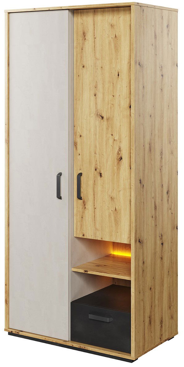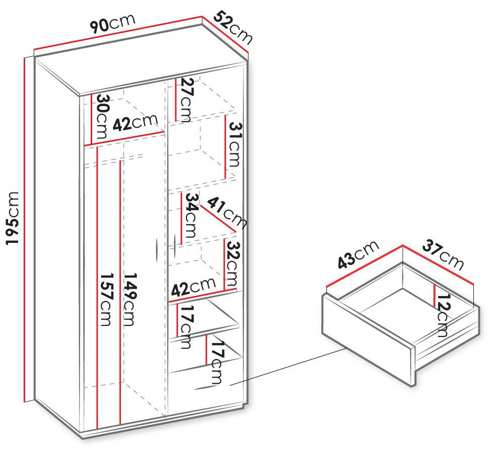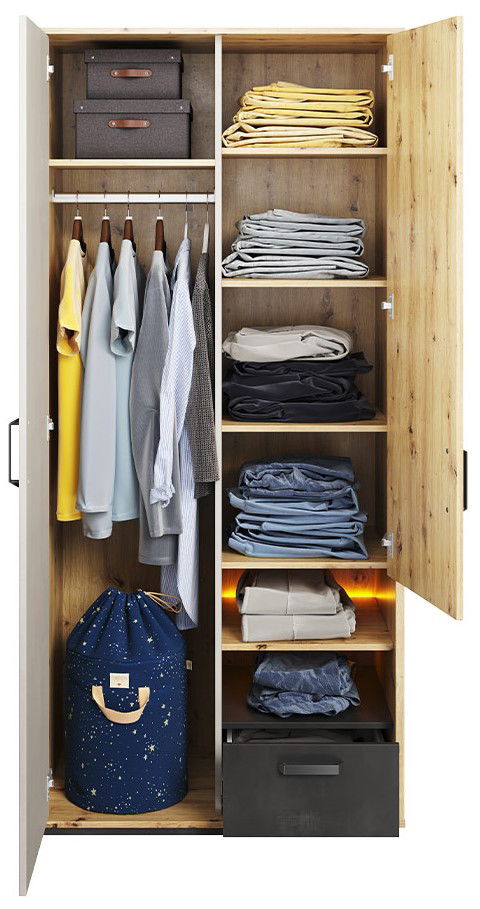 – Αριστερή πλευρά: Μονόφυλλη ντουλάπα με 1 ράγα και 1 μεγάλο ράφι