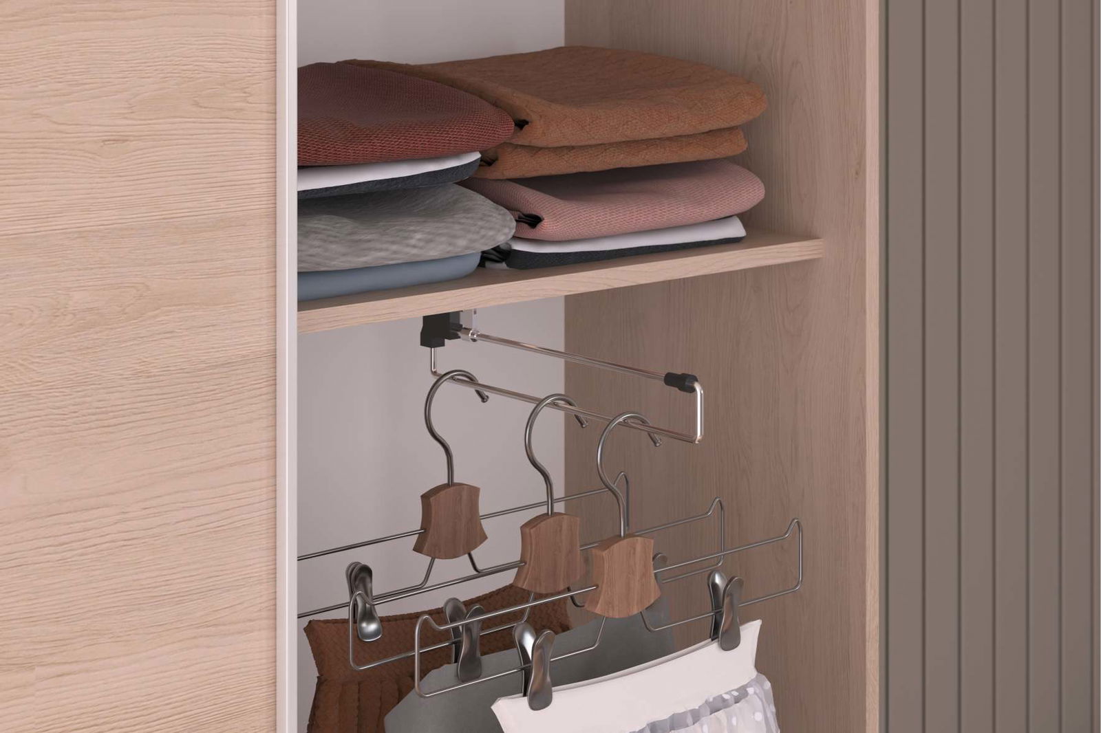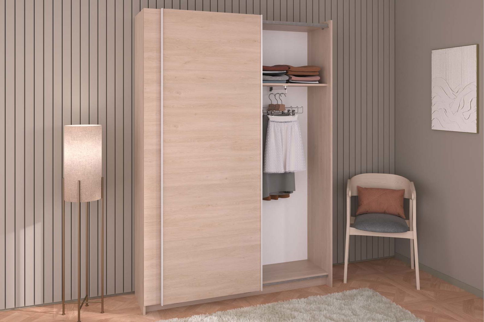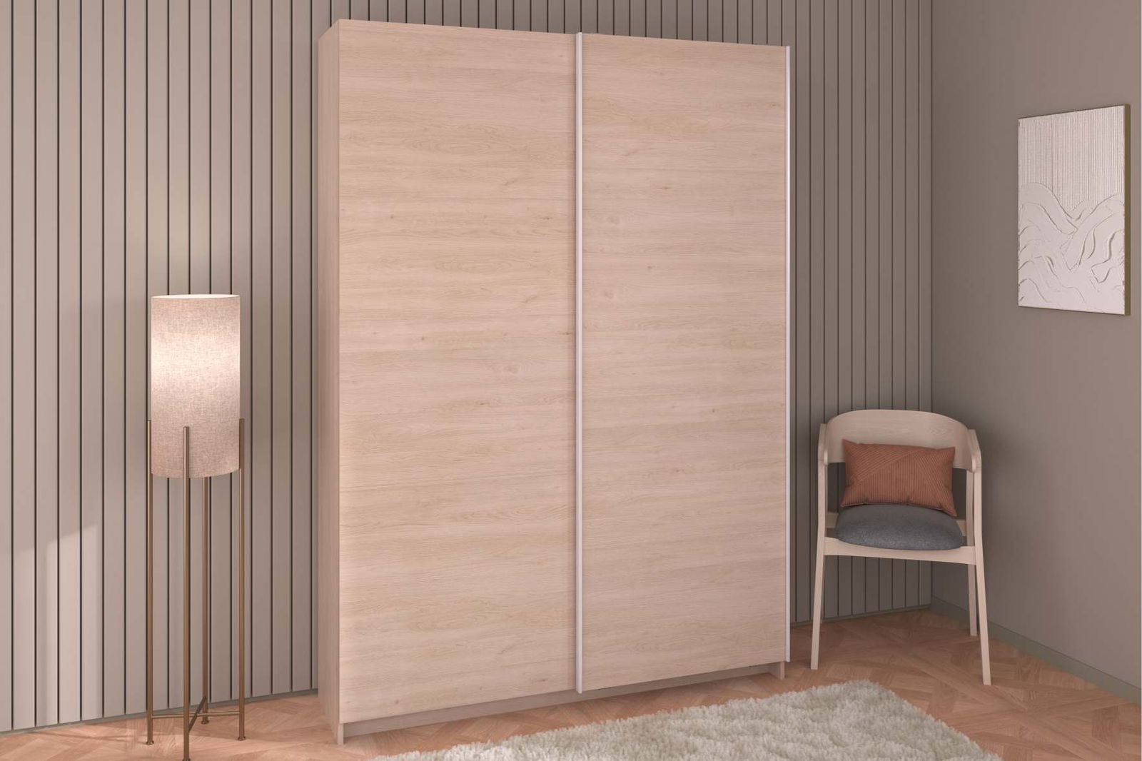 Η συρόμενη ντουλάπα Railly διατίθεται σε απαλό φυσικό χρωματισμό, ώστε να συμβάλλει σε μια πιο ήρεμη και ζεστή ατμόσφαιρα. Συνδυάστε την με τα υπόλοιπα έπιπλα της σειράς και δημιουργήστε ένα ολοκληρωμένο σετ υπνοδωματίου.