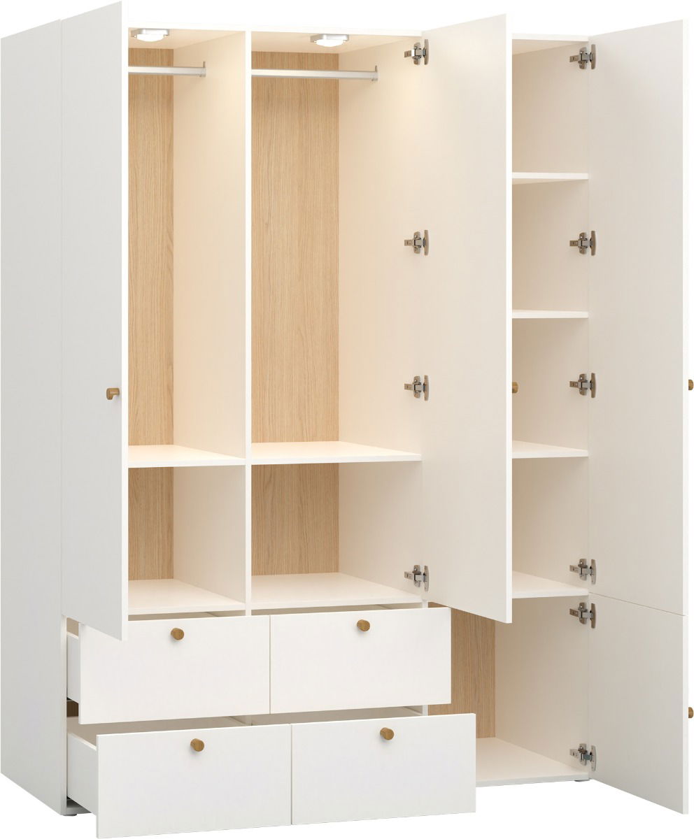 Η τρίφυλλη ντουλάπα από τη συλλογή Reli προσφέρει άφθονο χώρο για τα ρούχα και τα αξεσουάρ ενός εφήβου. Ο εσωτερικός φωτισμός LED διευκολύνει την εύρεση των αντικειμένων που θα αποθηκεύσατε, και τα ρυθμιζόμενα ράφια προσαρμόζονται στο μέγεθος των αποθηκευμένων ειδών