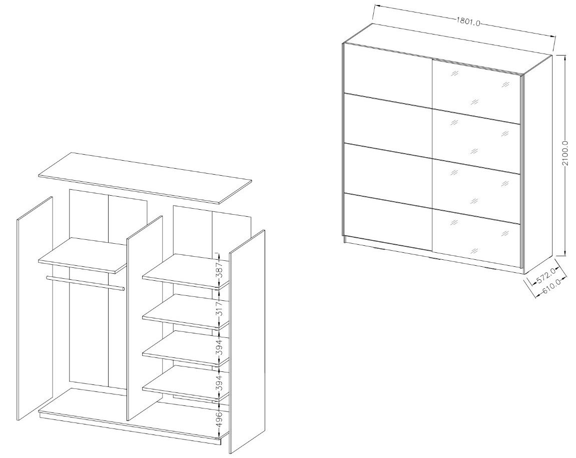 – 2 συμμετρικοί χώροι με σταθερό σύστημα ραφιών και ράβδο κρεμάστρας και 2 εσωτερικά μικρά πατάρια.