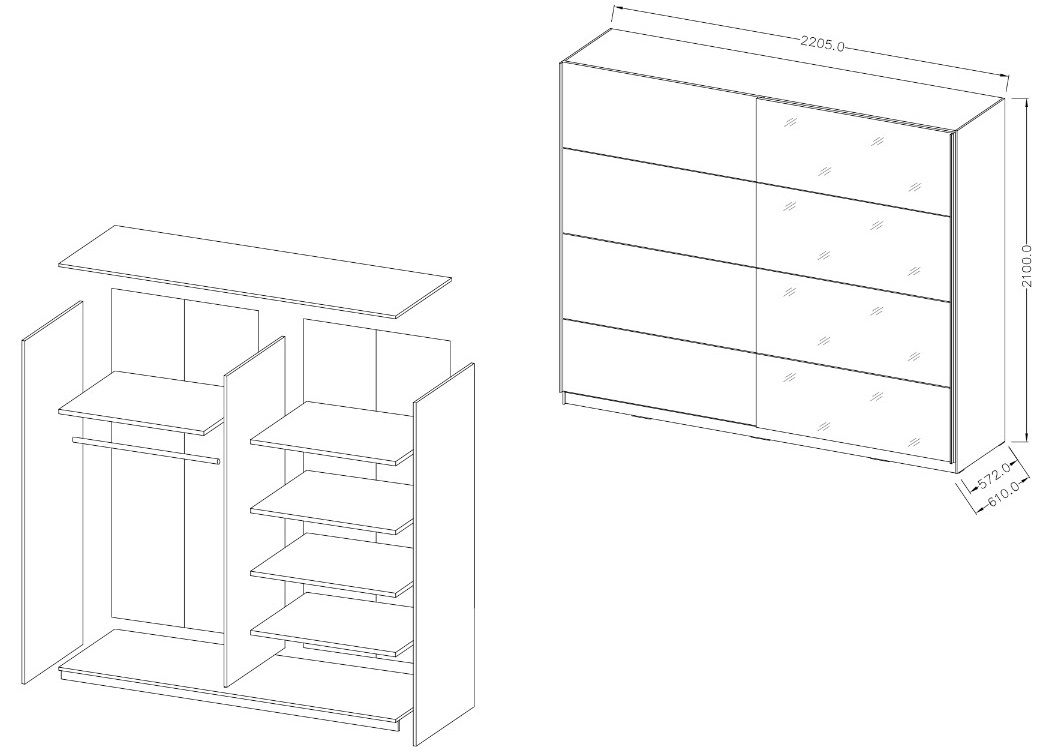 – 2 συμμετρικοί χώροι με σταθερό σύστημα ραφιών και ράβδο κρεμάστρας και 2 εσωτερικά μικρά πατάρια.