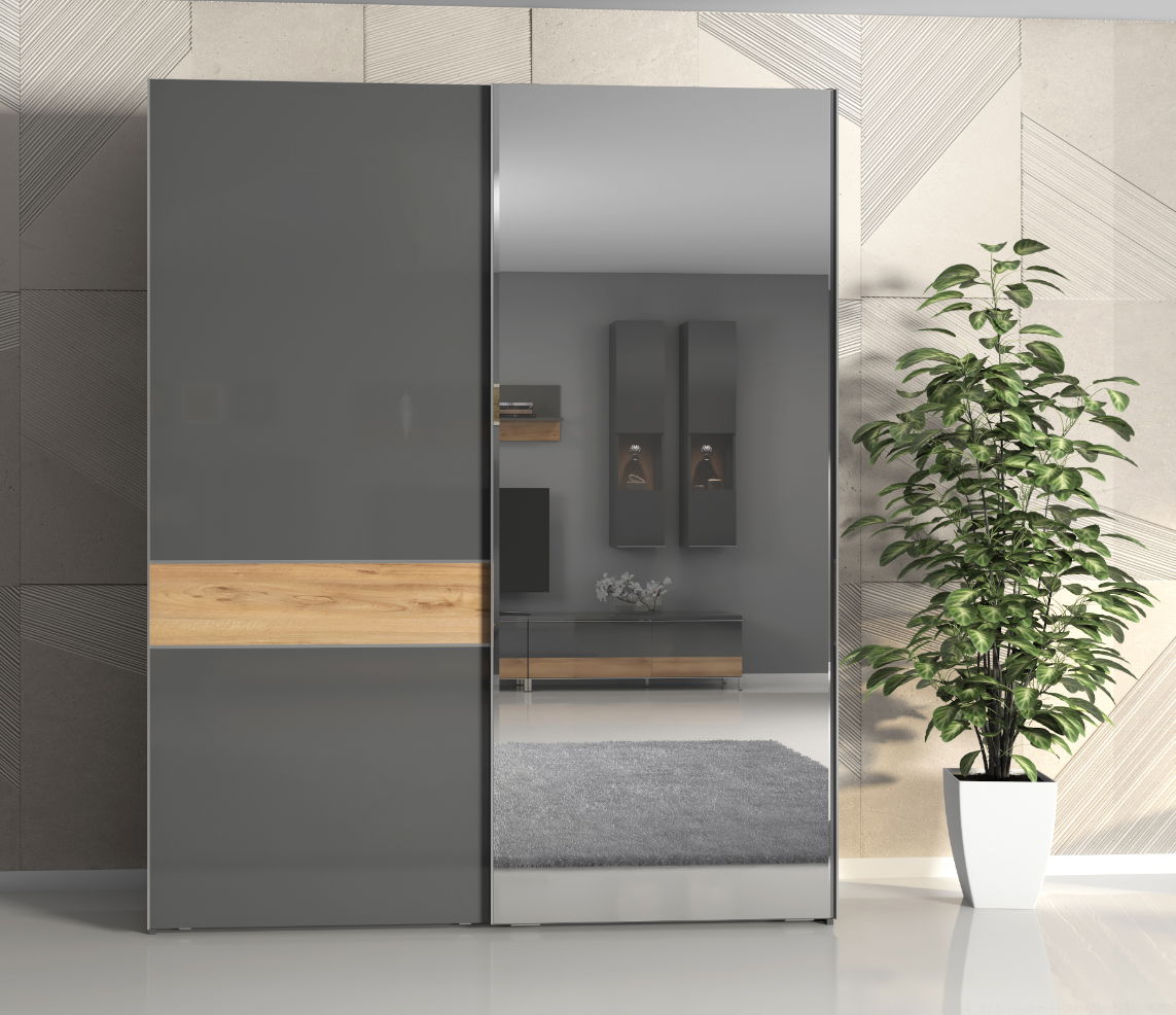 Η συρόμενη δίφυλλη ντουλάπα Agate 180 με καθρέπτη, είναι η ιδανική επιλογή για το υπνοδωμάτιο, σε σχεδιασμό μοντέρνας αισθητικής με λεπτομέρειες διχρωμίας, πρακτικές διαστάσεις και μεγάλο αποθηκευτικό χώρο.