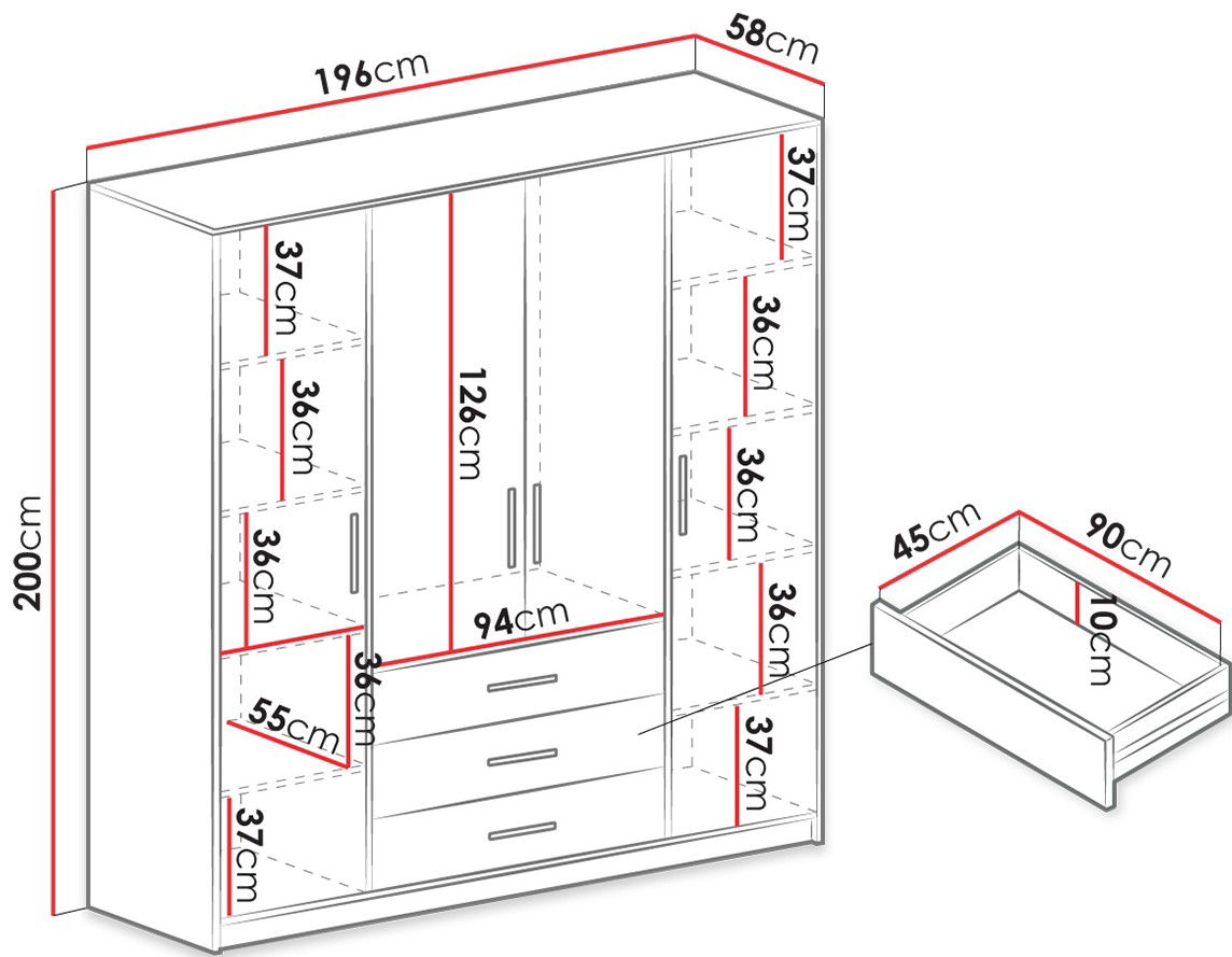 – 4 ράφια στο δεξί φύλλο της ντουλάπας