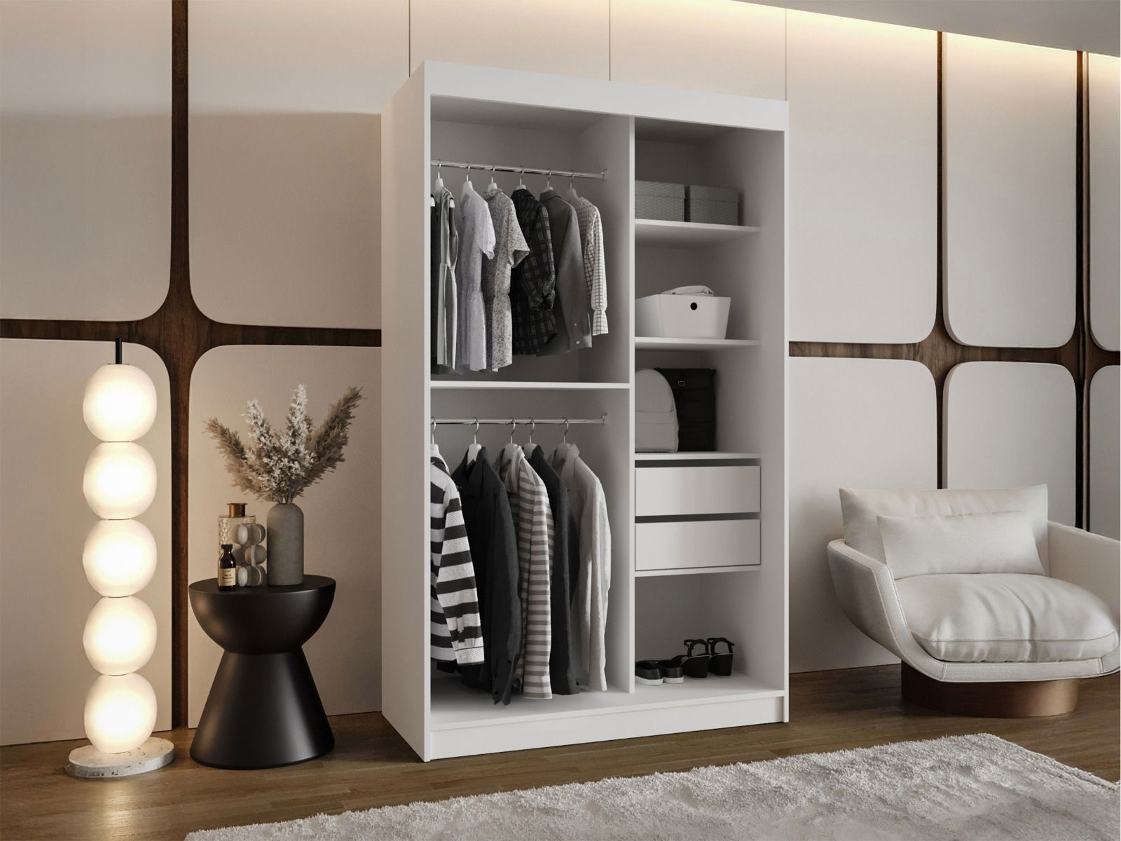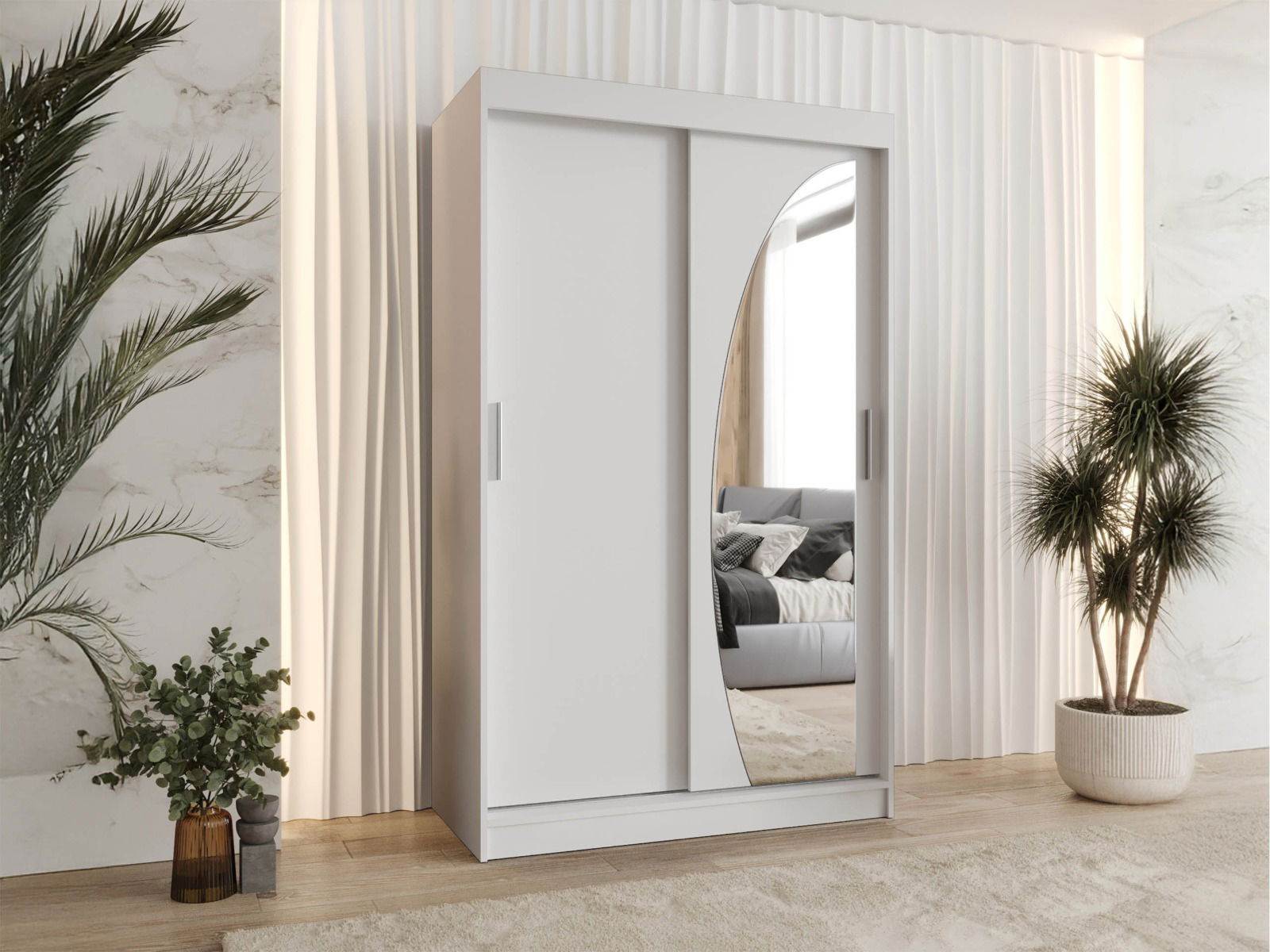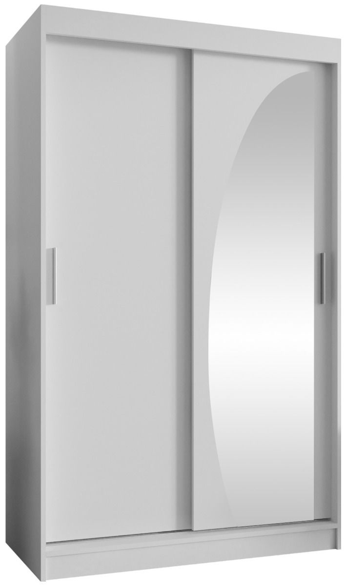 Η συρόμενη ντουλάπα Wika 120 είναι ένα κομψός και πρακτικός χώρος αποθήκευσης που δεν θα καταλαμβάνει πολύ χώρο στο δωμάτιο σας. Η προστιθέμενη αξία εδώ είναι ο καθρέφτης. Μια φαινομενικά κλασική προσθήκη, αλλά με χαρακτηριστικό σχήμα. Οι λεπτές καμπύλες με σαφή κοπή εκτελούν μια ενδιαφέρουσα διακόσμηση των επίπλων.