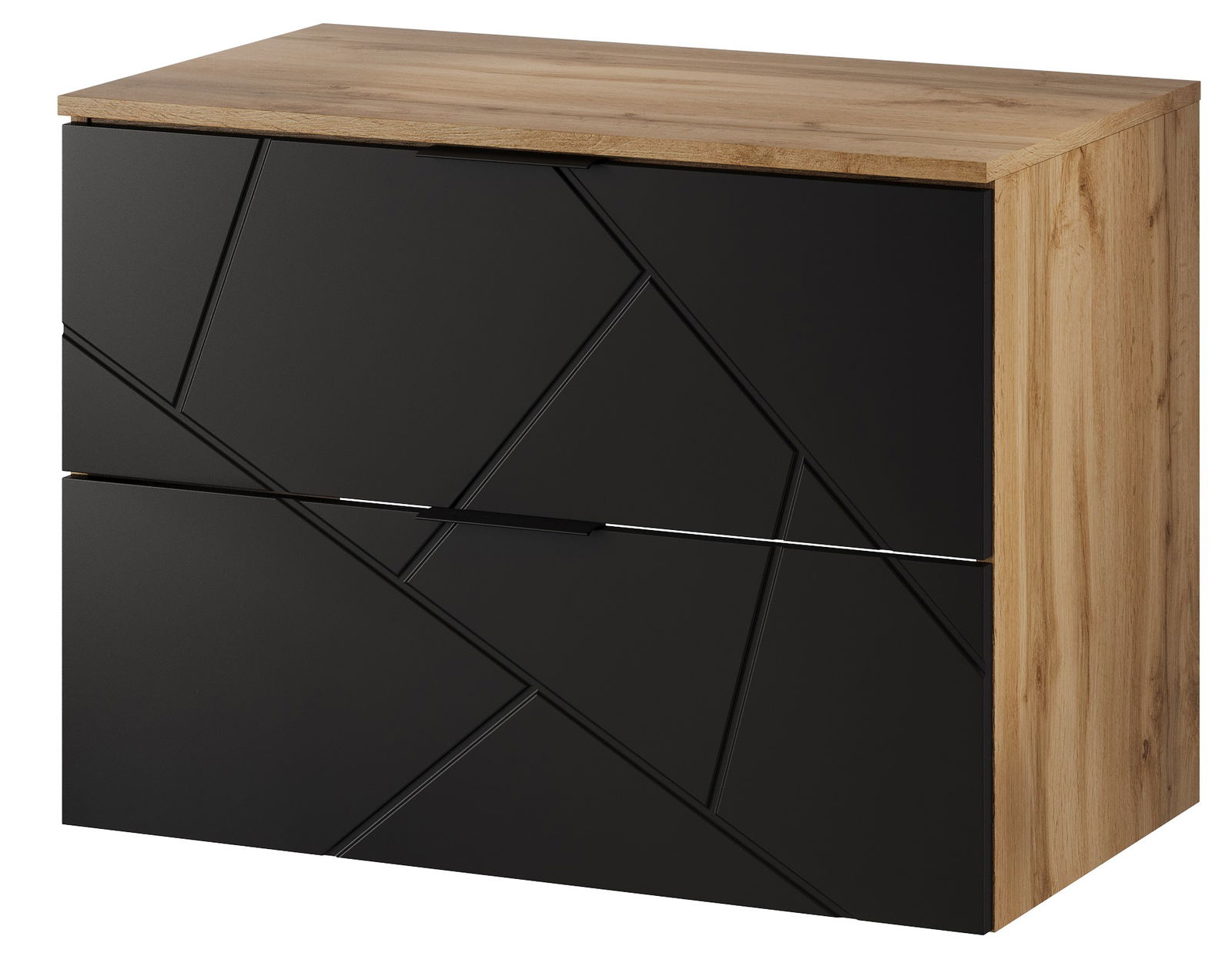 Η βάση νιπτήρα Mazi χαρακτηρίζεται από έναν μοντέρνο και κομψό σχεδιασμό που συνδυάζει τη λειτουργικότητα με τη διαχρονική αισθητική. Το ντουλάπι διαθέτει δύο συρτάρια, διακοσμημένα με ανάγλυφα γεωμετρικά σχέδια που προσδίδουν βάθος και ξεχωριστό στυλ. Οι διακριτικές μαύρες λαβές στο πάνω μέρος των συρταριών ενισχύουν την κομψότητα της κατασκευής, ενώ η επιφάνεια και τα πλαϊνά μέρη, σε φυσική απόχρωση ξύλου, δημιουργούν μια ευχάριστη αντίθεση. Αυτός ο σχεδιαστικός συνδυασμός μοντέρνου και φυσικού το καθιστά ιδανικό για μπάνια με σύγχρονη αισθητική και υψηλές απαιτήσεις σε ποιότητα και design. Συνδυάστε τον πάγκο με τα υπόλοιπα έπιπλα της σειράς και δημιουργήστε ένα ολοκληρωμένο σετ μπάνιου.