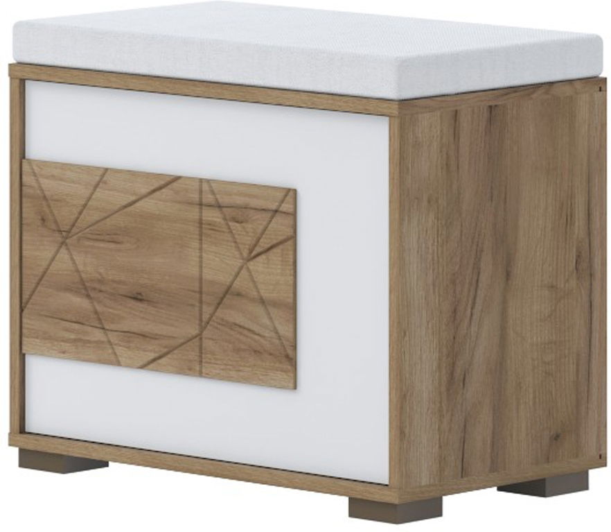 Πάγκος Stendal, μινιμαλ σχεδιασμού με λεπτομέρειες διχρωμίας λευκού – φυσικού ξύλου, ντουλάπι με εσωτερικό ράφι, προσωρινό κάθισμα αφρού για το δέσιμο των υποδημάτων και πρακτικές διαστάσεις που τον καθιστούν ιδανική επιλογή για τον χώρο της υποδοχής.