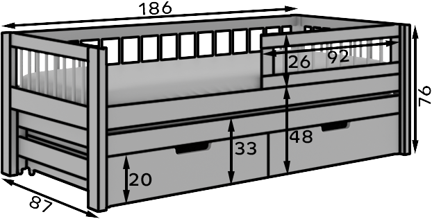 Παιδικό κρεβάτι Cielo είναι η ιδανική λύση για αδέρφια ή παιδιά που χρειάζονται περισσότερο χώρο. Το διπλό κρεβάτι διατίθεται σε δύο μεγέθη: 180×80 cm και 200×90 cm, γεγονός που επιτρέπει την προσαρμογή του σε διαφορετικές ανάγκες και μεγέθη δωματίων.