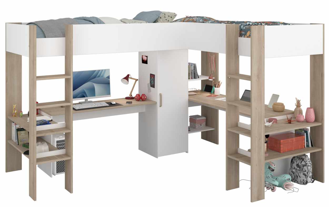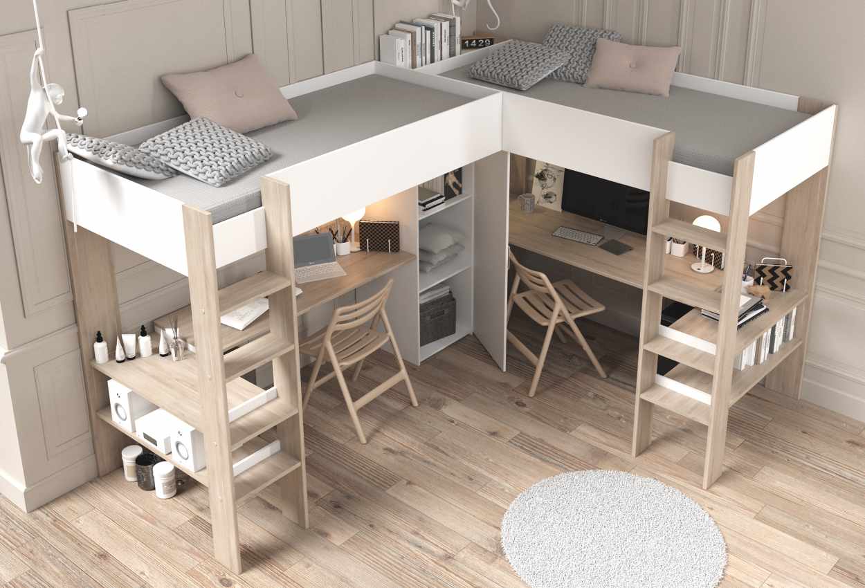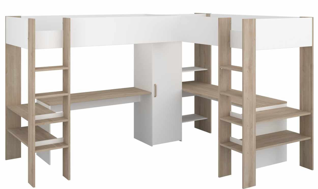 Η πολυλειτουργική γωνιακή κουκέτα Alex, αποτελεί την ιδανική επιλογή για ένα εφηβικό δωμάτιο. Η γωνιακή κουκέτα έχει δύο ευρύχωρα γραφεία κάτω από κάθε κρεβάτι, δίνοντας σε κάθε παιδί το δικό του χώρο. Τα ενσωματωμένα ράφια και η επιφάνεια του γραφείου προσθέτουν πρακτικότητα παρέχοντας έξυπνο αποθηκευτικό χώρο. Τα παιδιά σας μπορούν να οργανώνουν εύκολα τα βιβλία τους, τα σχολικά τους είδη και τα προσωπικά τους αντικείμενα. Συνδυάζει ύπνο, μελέτη και οργάνωση. Το χρώμα του θα ανανεώσει την αισθητική του δωματίου, ενώ παράλληλα θα εξοικονομήσετε χώρο!