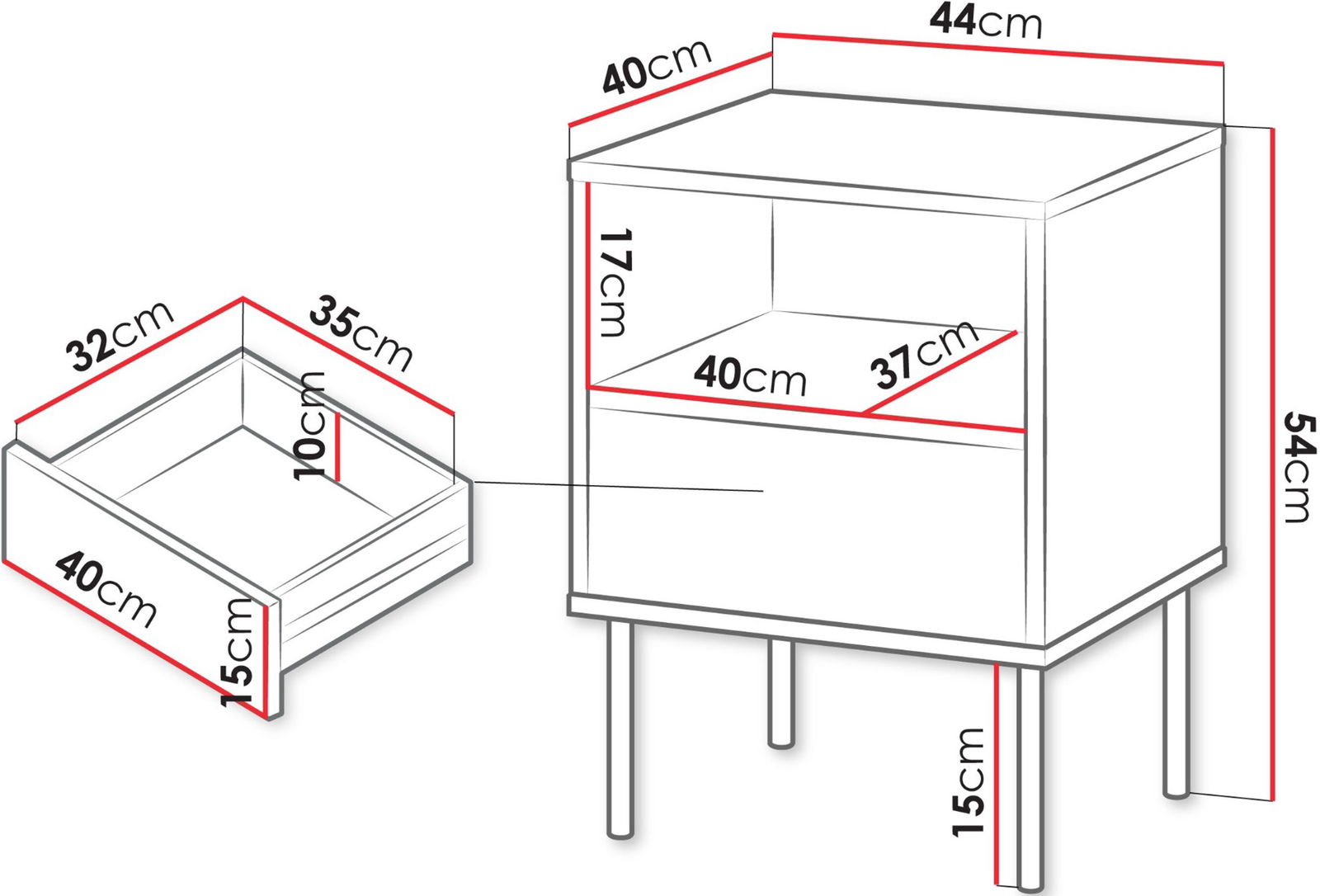– Ένα ράφι και ένα συρτάρι ανα κομοδίνο