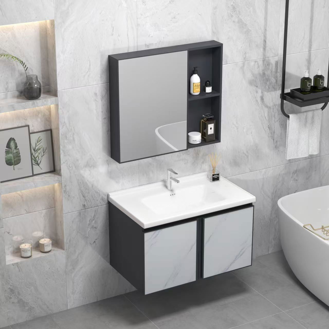 Σετ μπάνιου Estelle μοντέρνου σχεδιασμού με μοτίβο μάρμαρο στην πρόσοψη. Το σετ αποτελείται από ένα επιτοίχιο έπιπλο με δύο ντουλάπια και ένθετο νιπτήρα και ένα επιτοίχιο ντουλάπι με καθρέπτη και εξωτερικά ράφια για διακοσμητικά ή και άλλα αντικείμενα της προτίμησης σας.Ο άνετος αποθηκευτικός χώρος εντός των ντουλαπιών χαρίζει στο σετ μεγαλύτερη χρηστική αξία την οποία έρχεται να συμπληρώσει η υψηλής ποιότητας κατασκευής μπαταρία καθώς και η βαλβίδα και το σιφώνι που είναι απαραίτητα για την σύνδεση. Το υλικό κατασκευής του το καθιστά ανθεκτικό στην υγρασία και εύκολο στο καθάρισμα.
