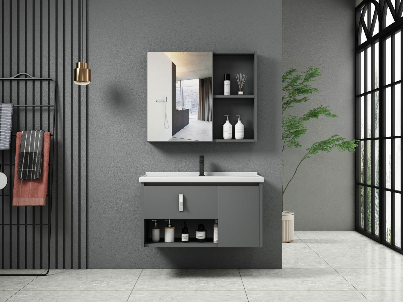 Σετ μπάνιου Ezra μίνιμαλ σχεδιασμού με βολικές διαστάσεις που εξυπηρετούν ακόμα και μικρότερους χώρους. Το σετ αποτελείται από ένα επιτοίχιο επίπλο αποτελούμενο απο δυο ντουλάπια και ένα ανοιχτό ράφι συνοδευόμενα απο έναν ένθετο νιπτήρα και ένα επιτοίχιο ντουλάπι με καθρέπτη και εξωτερικά ράφια για διακοσμητικά ή και άλλα αντικείμενα της προτίμησης σας. Ο άνετος αποθηκευτικός χώρος εντός των ντουλαπιών χαρίζει στο σετ μεγαλύτερη χρηστική αξία την οποία έρχεται να συμπληρώσει η υψηλής ποιότητας κατασκευής μπαταρία καθώς και η βαλβίδα και το σιφώνι που είναι απαραίτητα για την σύνδεση. Το υλικό κατασκευής του το καθιστά ανθεκτικό στην υγρασία και εύκολο στο καθάρισμα.