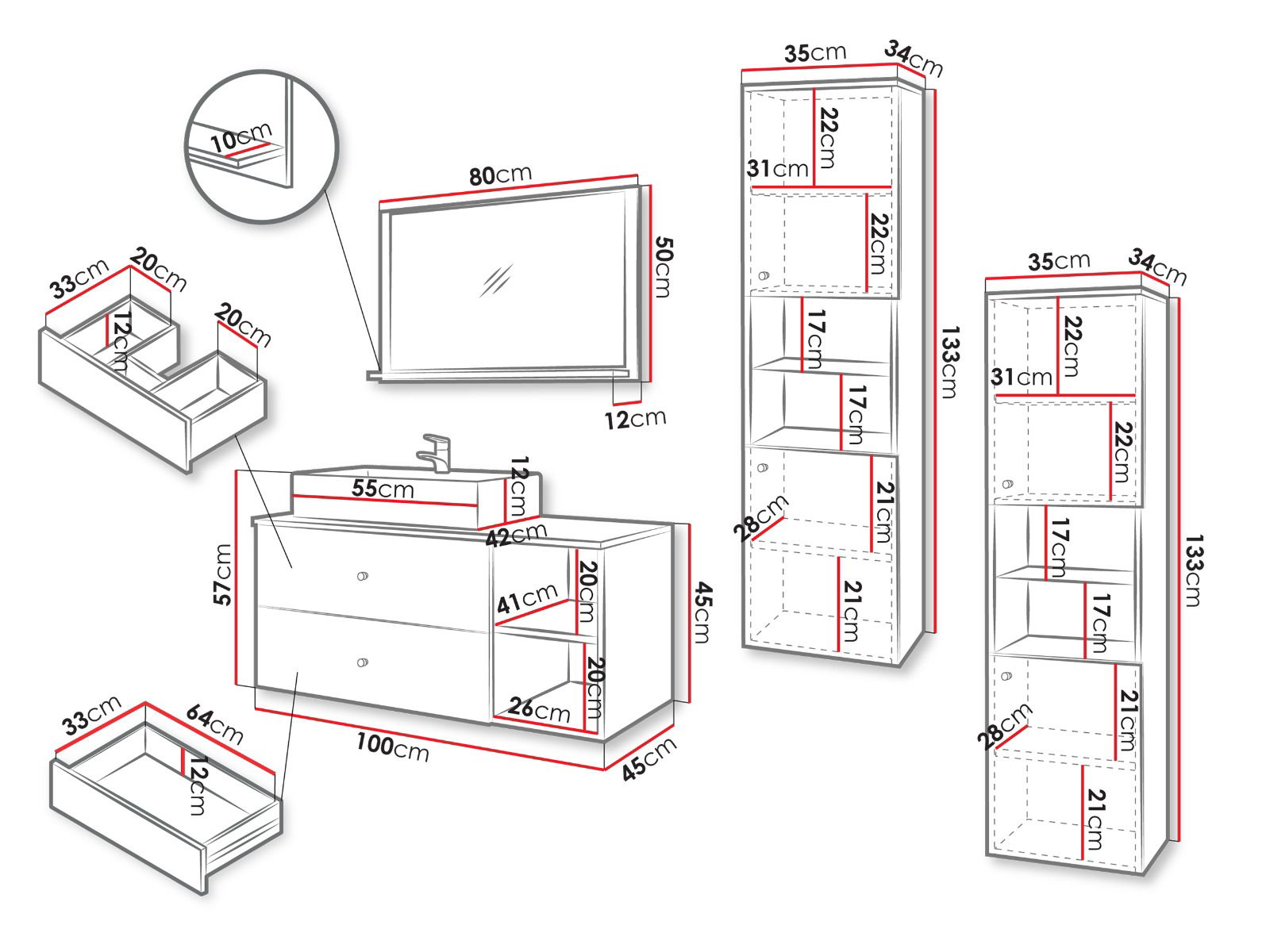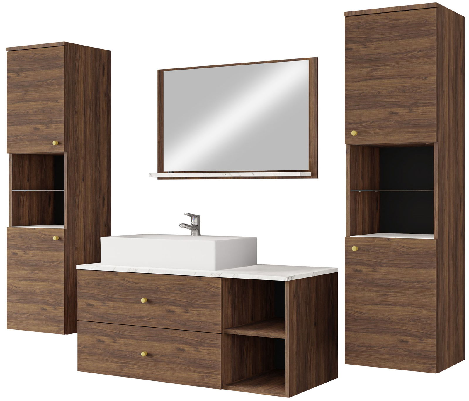 Το Σετ μπάνιου Kertos III θα προσελκύσει τους λάτρεις των πρακτικών λύσεων. Ο μινιμαλιστικός σχεδιασμός θα ταιριάξει σχεδόν σε κάθε σύνθεση διάταξης. Μια λεπτή πινελιά με τη μορφή μαρμάρινου μοτίβου στην κορυφή προσθέτει διακριτική κομψότητα και νεωτερικότητα στο σύνολο. Τα μοντέρνα έπιπλα μπάνιου προσφέρουν άφθονο χώρο για οργάνωση.