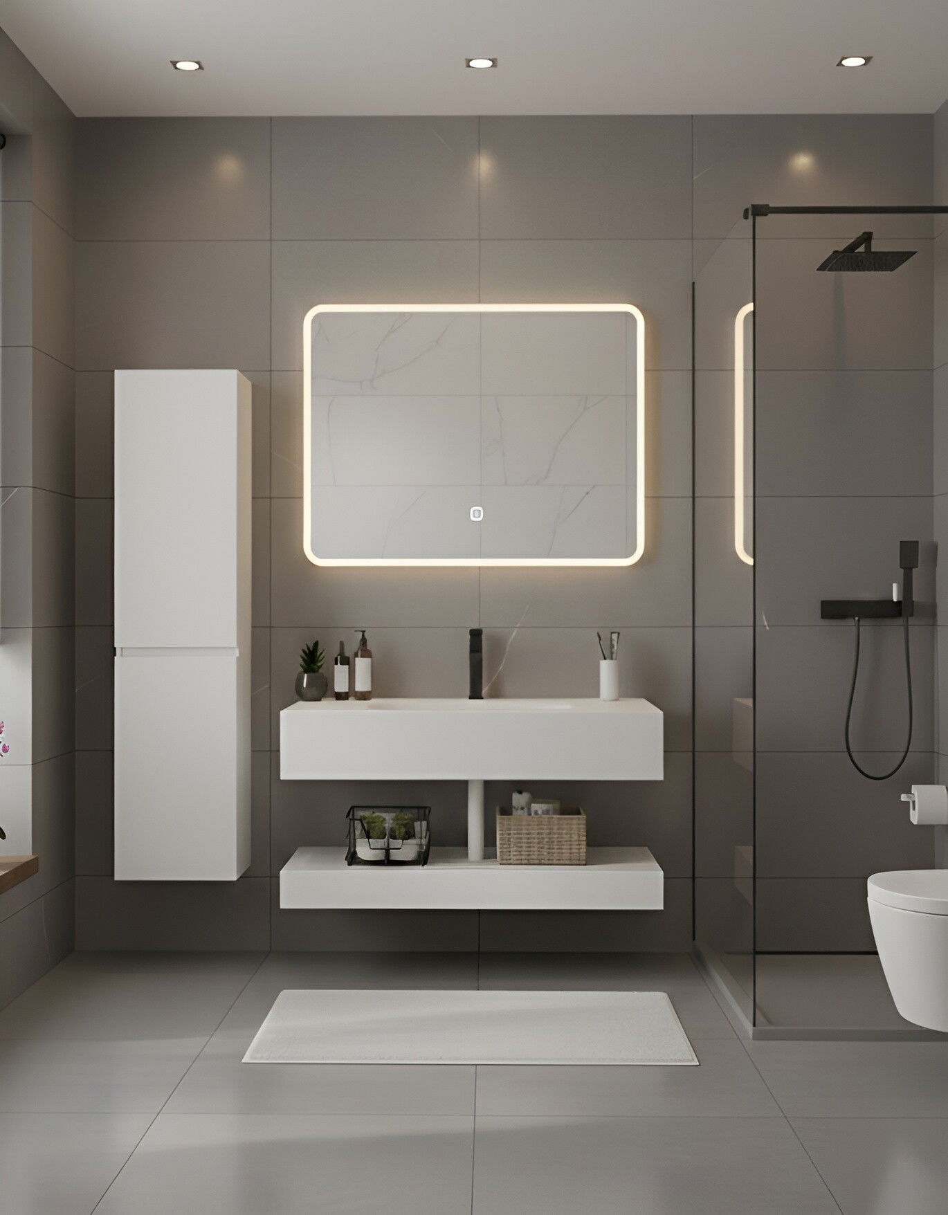 Σετ μπάνιου Thyra μοντέρνου σχεδιασμού από συνθετική πέτρα, κατάλληλο για κάθε χώρο, ακόμη και μικρότερους. Το σετ περιλαμβάνει έναν επιτοίχιο νιπτήρα, ένα επιτοίχιο ράφι και καθρέπτη με LED φωτισμό. Η εργονομική διάταξη προσφέρει πρακτικό αποθηκευτικό χώρο, ενώ η υψηλής ποιότητας κατασκευή εξασφαλίζει ανθεκτικότητα στην υγρασία και εύκολο καθάρισμα.