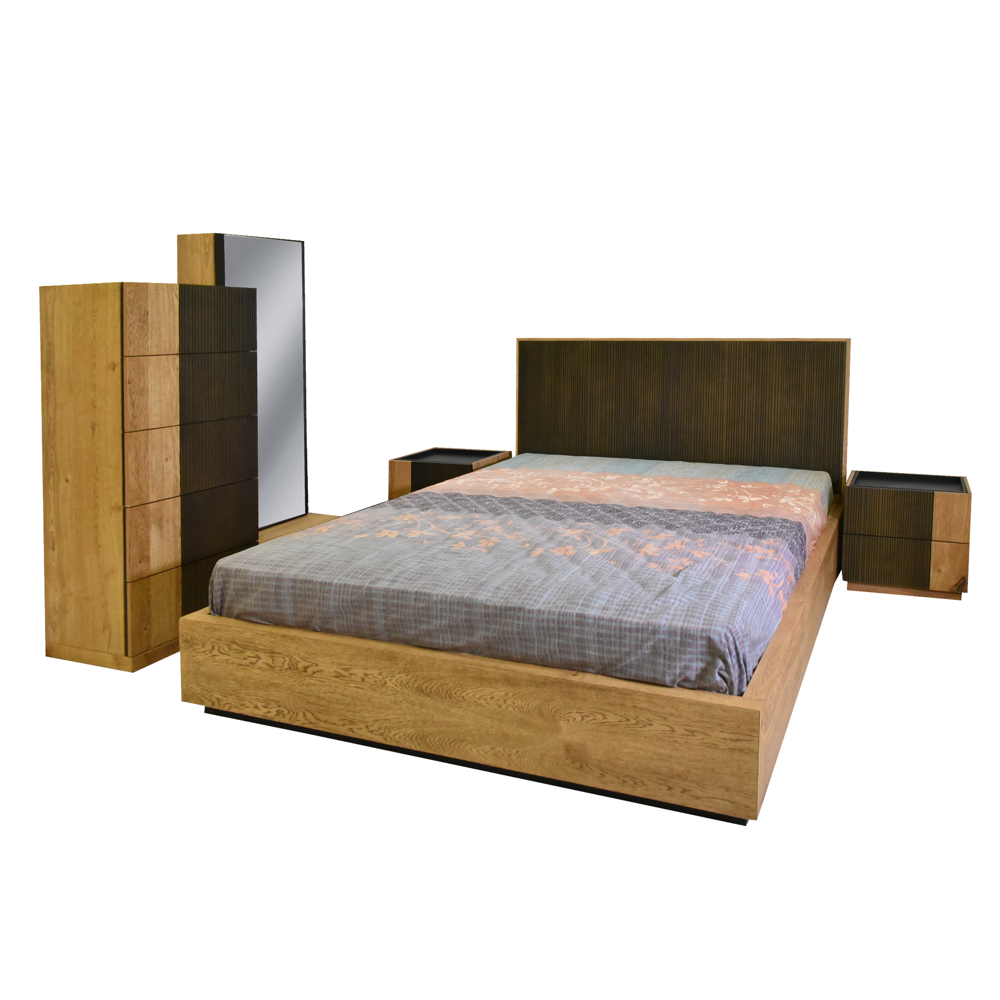 Ανανεώστε την αισθητική της κρεβατοκάμαράς σας με αυτό το κομψό σετ που συνδυάζει μοντέρνο σχεδιασμό, λειτουργικότητα και υψηλή ποιότητα κατασκευής. Το σετ αποτελείται από κρεβάτι με εντυπωσιακό κεφαλάρι, δύο κομοδίνα και συρταριέρα με καθρέφτη, δημιουργώντας ένα ολοκληρωμένο και αρμονικό σύνολο για τον χώρο σας.Ο συνδυασμός φυσικής ξύλινης απόχρωσης με σκούρες λεπτομέρειες προσφέρει ένα ζεστό αλλά ταυτόχρονα σύγχρονο αποτέλεσμα που ταιριάζει εύκολα σε κάθε στυλ διακόσμησης. Το επιβλητικό κεφαλάρι με διακριτική ανάγλυφη υφή προσθέτει χαρακτήρα και κομψότητα, ενώ τα κομοδίνα και η συρταριέρα παρέχουν πρακτικούς αποθηκευτικούς χώρους για την καθημερινή οργάνωση.Η στιβαρή κατασκευή του σετ εξασφαλίζει αντοχή στον χρόνο και άνεση στη χρήση, αποτελώντας μια ιδανική επιλογή για μια ολοκληρωμένη και λειτουργική κρεβατοκάμαρα.Υλικό δρύς.Διαστάσεις 2.12 * 171.5.(Δεν συμπεριλλαμβάνεται το στρώμα).ΕΛΛΗΝΙΚΗΣ ΚΑΤΑΣΚΕΥΗΣ