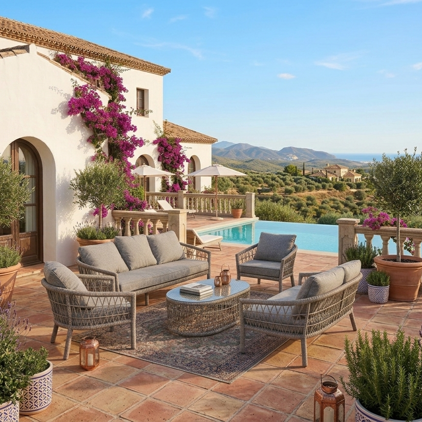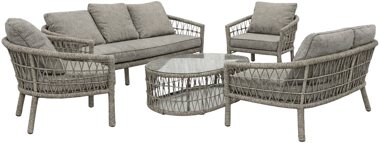 Σετ σαλονιού Legato, μοντέρνου σχεδιασμού, με αναπαυτικό κάθισμα και πλέξη σχοινιού γύρω από τον μεταλλικό σκελετό, ιδανική επιλογή για τον κήπο ή το μπαλκόνι.