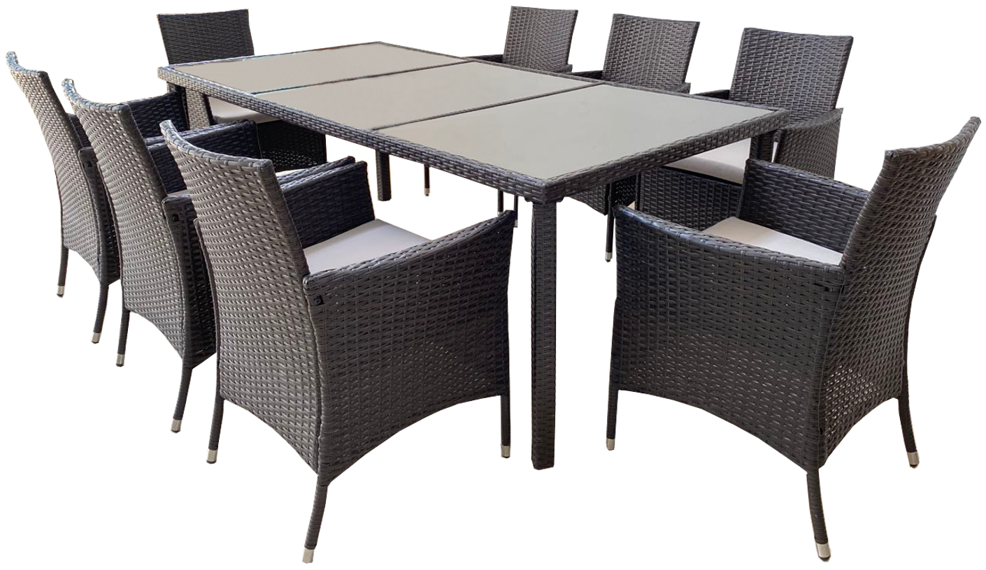 Σετ τραπεζαρίας Dunfer, μοντέρνου σχεδιασμού, ιδανικό για τον κήπο ή το μπαλκόνι σας. Το σετ αποτελείται από 8 πολυθρόνες και 1 τραπέζι.