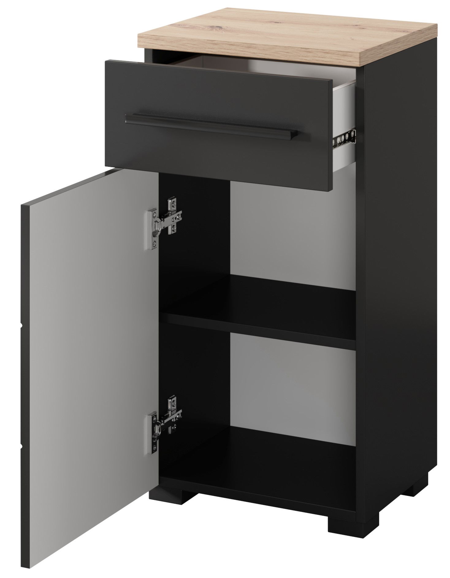 Στήλη μπάνιου Martin mini με μοντέρνα αισθητική, ιδανικό για μικρούς χώρους. Η πόρτα του ντουλαπιού ανοίγει για να αποκαλύψει δύο επίπεδα αποθήκευσης, παρέχοντας άφθονο χώρο για την τακτοποίηση αντικειμένων. Η φυσική όψη ξύλου στο πλαίσιο προσθέτει ζεστασιά και αντίθεση, δημιουργώντας έναν αρμονικό συνδυασμό που ταιριάζει απόλυτα σε μοντέρνα μπάνια και χώρους με σύγχρονη διακόσμηση. Συνδυάστε τη στήλη με τα υπόλοιπα έπιπλα της σειράς και δημιουργήστε ένα ολοκληρωμένο σετ μπάνιου.