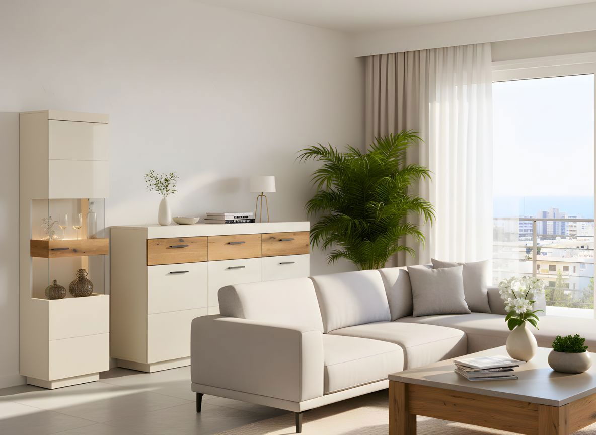 Η στήλη της σειράς Warmia αποτελεί μια κομψή και πολυλειτουργική μονάδα αποθήκευσης, η οποία αξιοποιεί το ύψος του δωματίου προσφέροντας παράλληλα σημεία για την ανάδειξη διακοσμητικών αντικειμένων. Ο σχεδιασμός της συνδυάζει τις συμπαγείς επιφάνειες με τη διαφάνεια του γυαλιού, διατηρώντας τη στιβαρή αισθητική της συλλογής.
