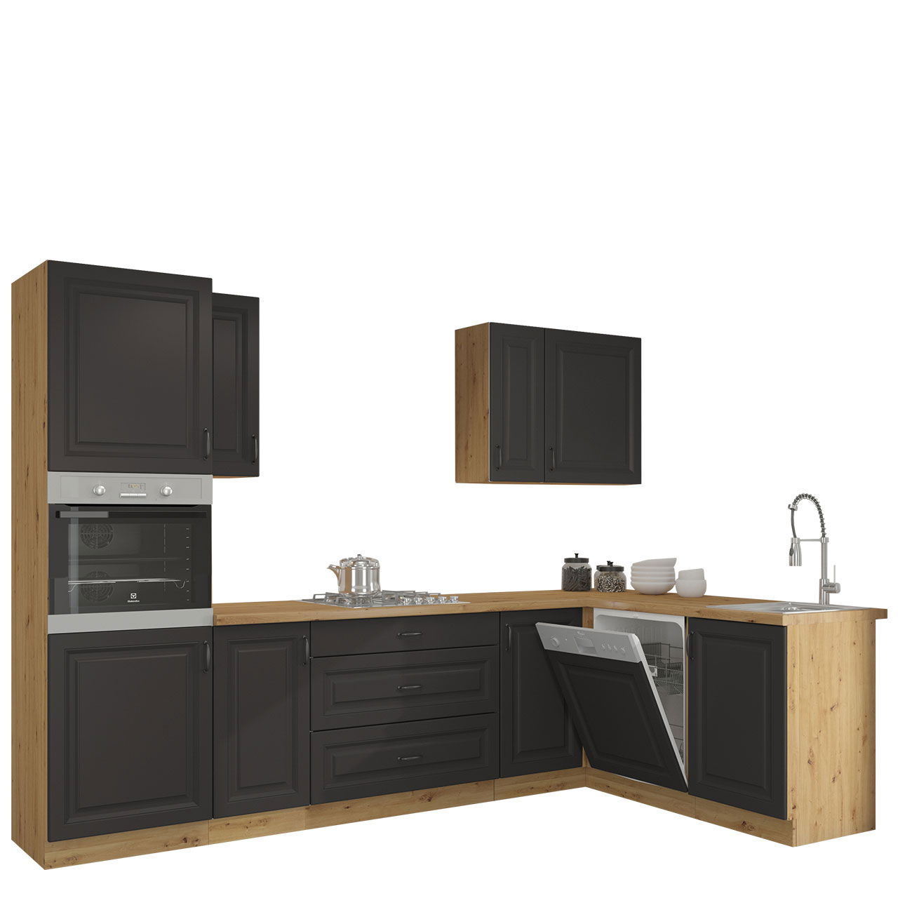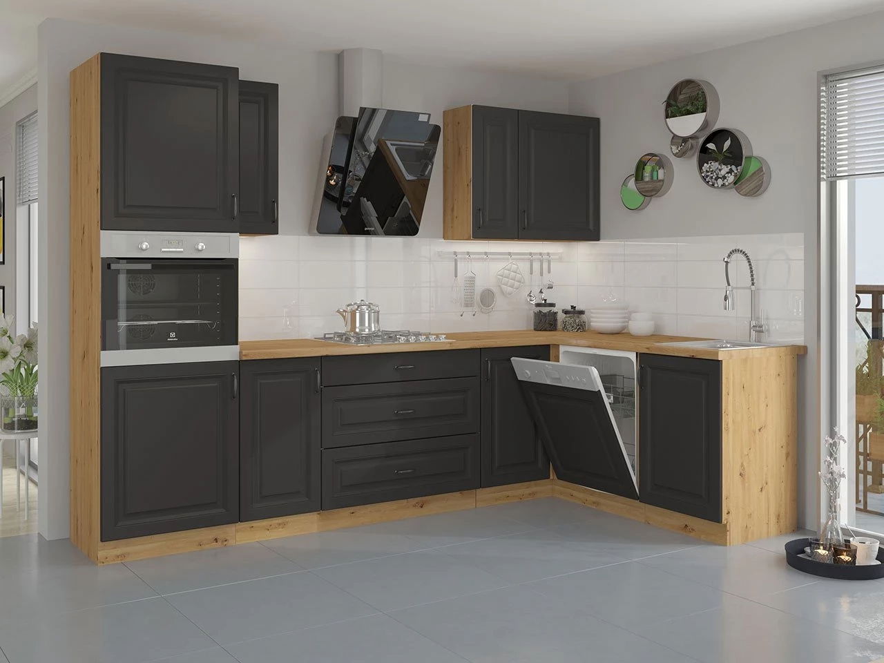 Η διαχρονική σύνθεση κουζίνας Retroline I συνδυάζει τον κλασικό σχεδιασμό με τη σύγχρονη λειτουργικότητα. Τα βολικά ντουλάπια, σε συνδυασμό με τους ξύλινους πάγκους, δημιουργούν έναν καθαρό και φιλόξενο χώρο.