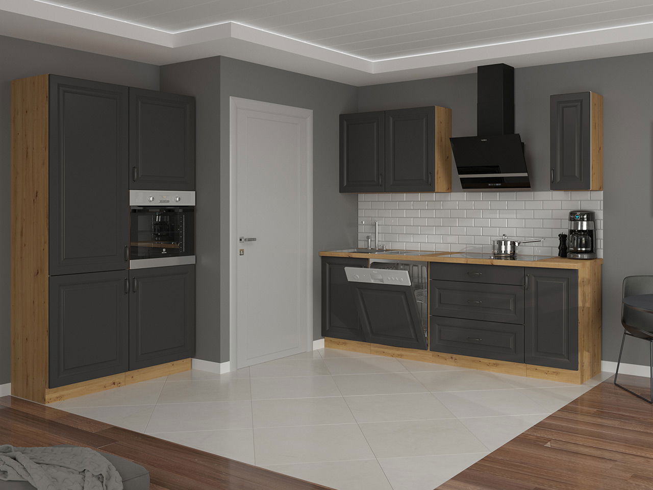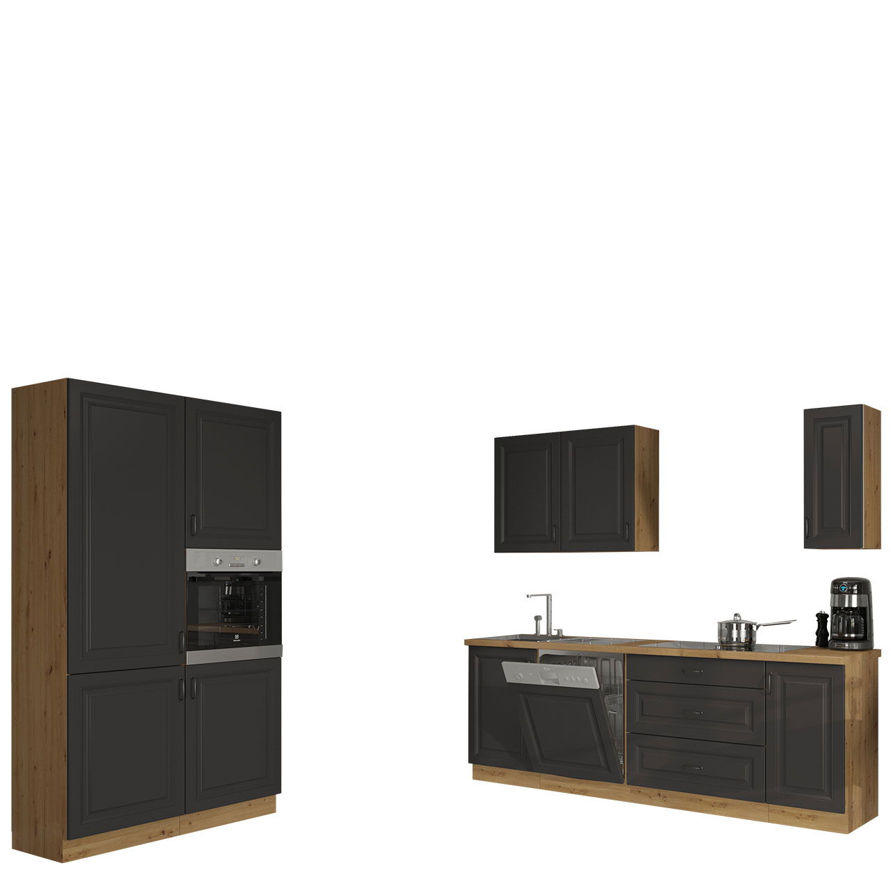 Η διαχρονική σύνθεση κουζίνας Retroline III συνδυάζει τον κλασικό σχεδιασμό με τη σύγχρονη λειτουργικότητα. Τα βολικά ντουλάπια, σε συνδυασμό με τους ξύλινους πάγκους, δημιουργούν έναν καθαρό και φιλόξενο χώρο.
