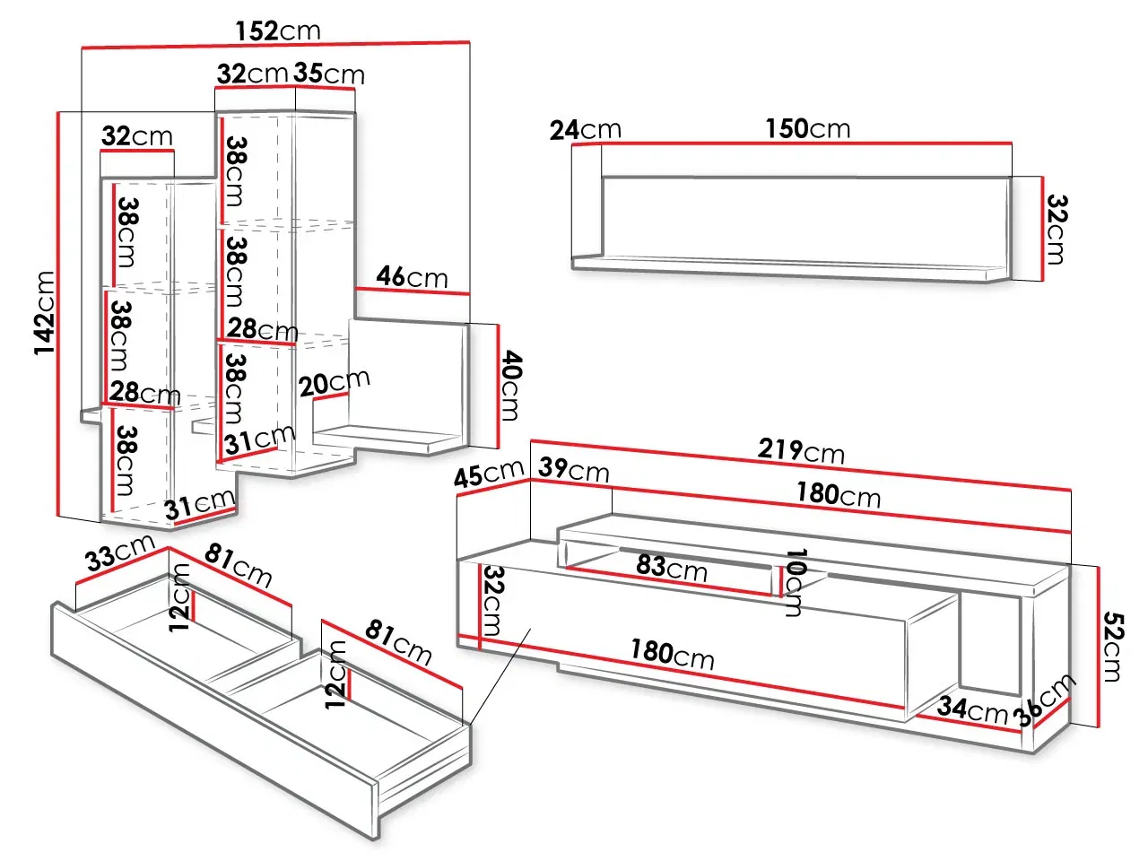 – 1 ευρύχωρο συρτάρι στην βάση τηλεόρασης με 2 εσωτερικούς χώρους