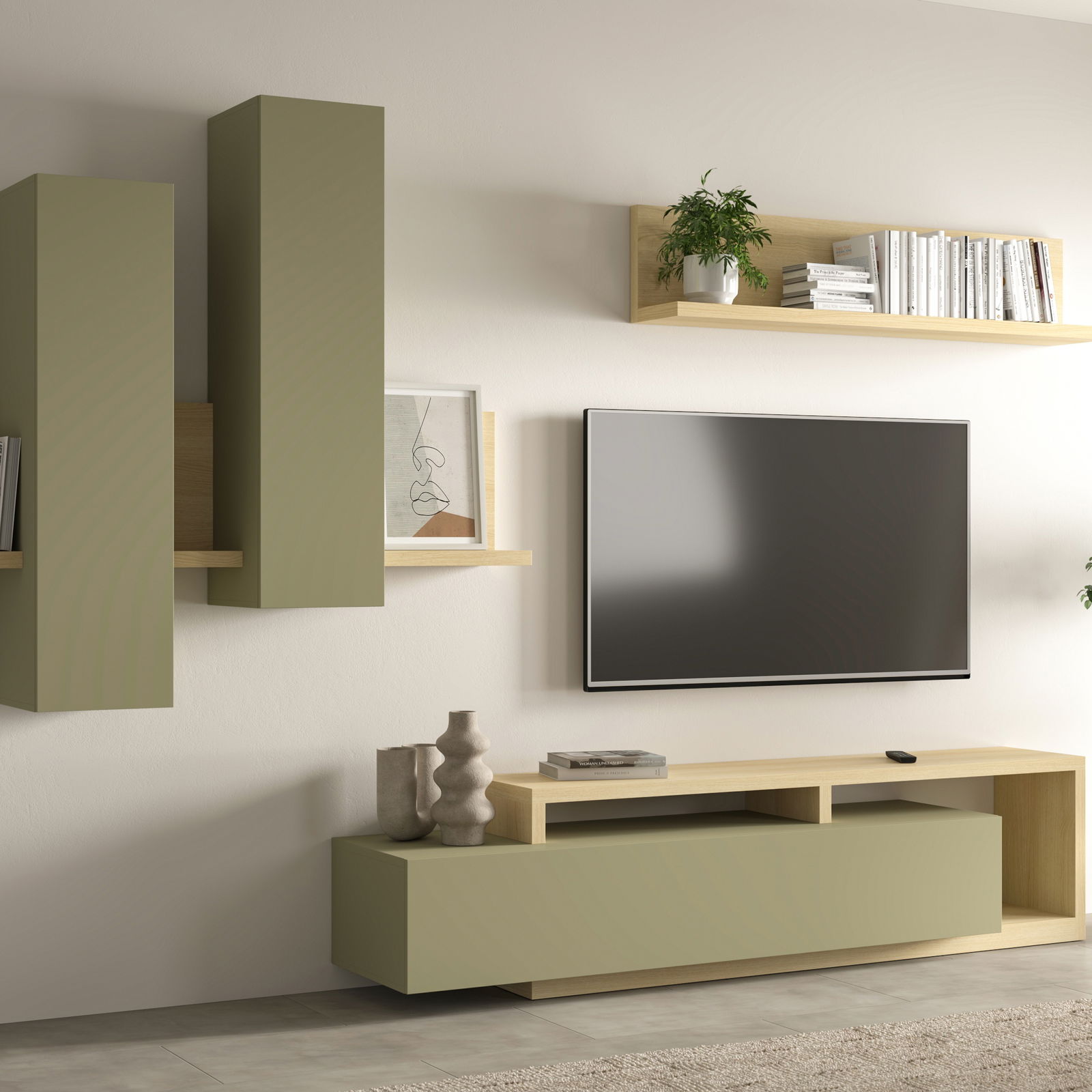 Σύνθεση Bron, σε όμορφες διχρωμίες και μοναδικού σχεδιασμού βάση και βιτρίνα. Οι ευρύχωρες επιφάνειες θα προσφέρουν χώρο για τοποθέτηση διακοσμητικών ή και χρηστικών αντικειμένων, δίνοντας μια επιπλέον πρακτικότητα στην σύνθεση. Παράλληλα, ο χρωματισμός δημιουργεί μια ζεστή και όμορφη ατμόσφαιρα, ενώ η ιδιαίτερη διάταξη και κατασκευή τους δίνει μια μοντέρνα αίσθηση στο σαλόνι.