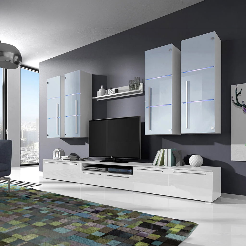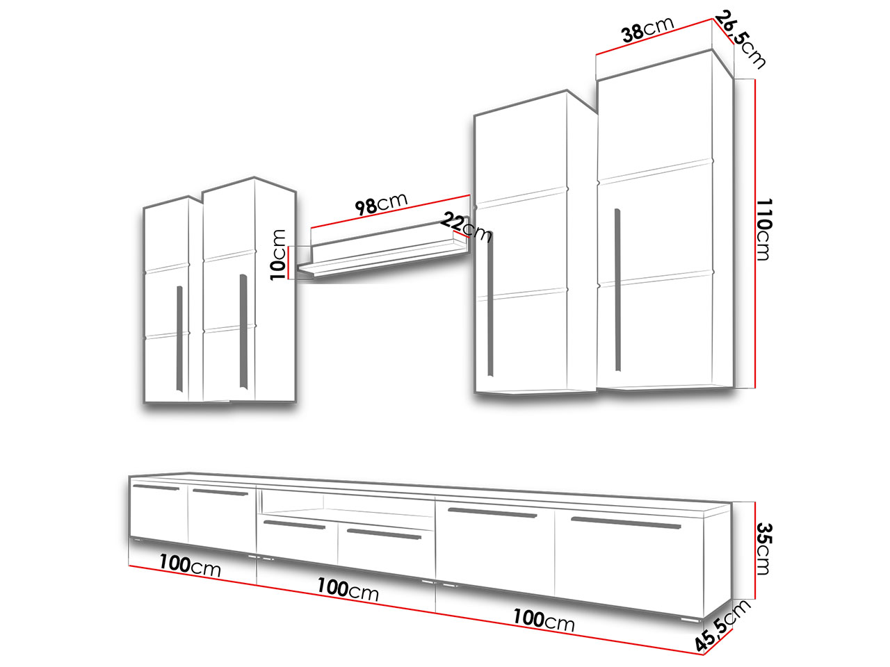 – Περιλαμβάνει 1 βάση τηλεόρασης με ντουλάπια και ράφι,2 βάσεις τηλεόρασης με ντουλάπια, 4 κρεμαστά ντουλάπια και 1 ράφι